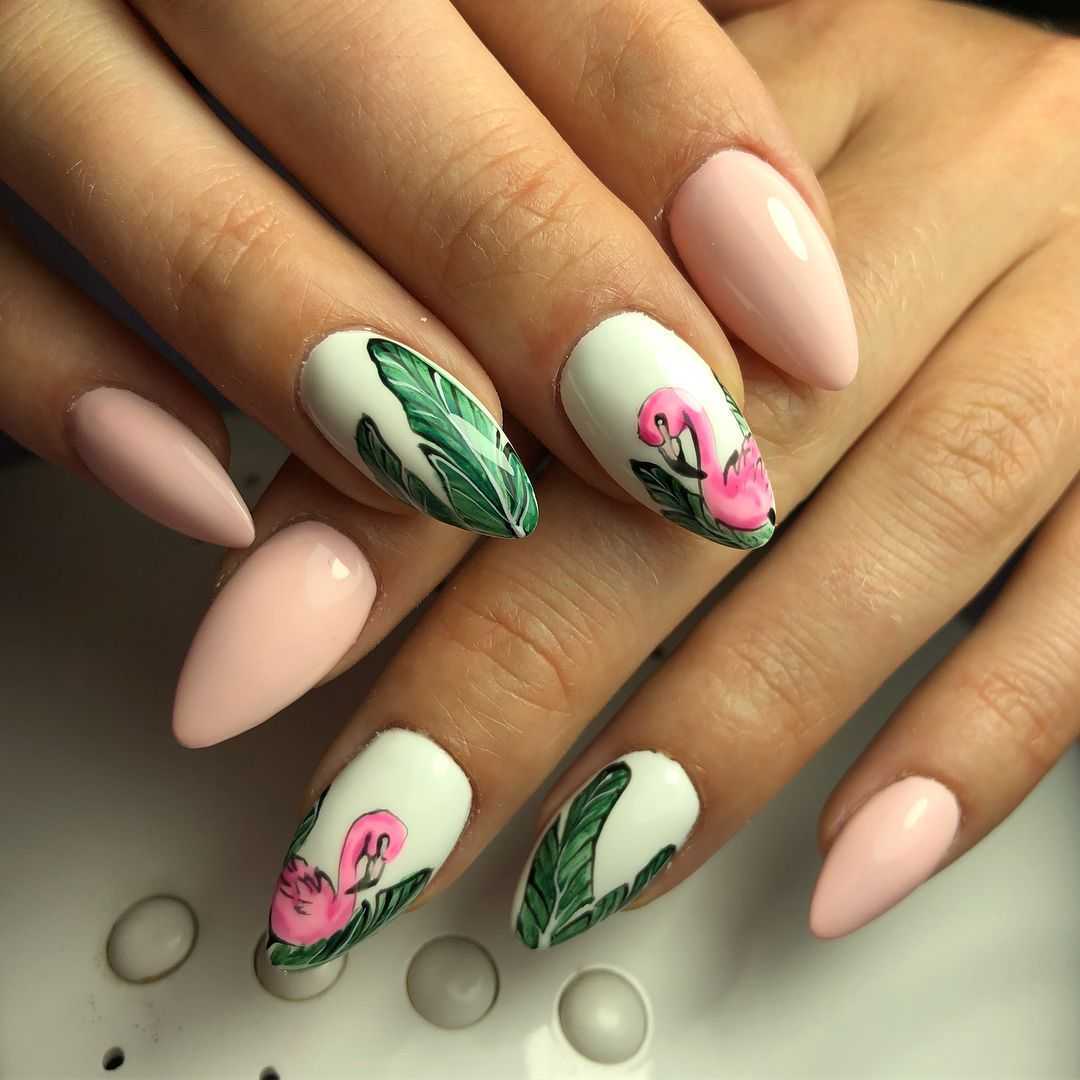Не хотите отставать от моды? Тогда вам точно придется по вкусу маникюр с фламинго и листьями, который завоевал расположение самых стильных леди нашей планеты. Подобный узор чаще всего встречается в цвете, но не менее эффектно он будет смотреться, если выполнен в духе минимализма, где цветные узоры сменяются черными.