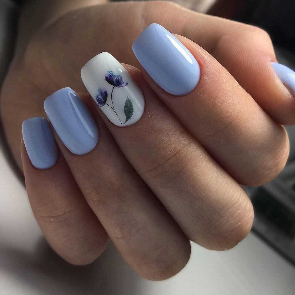 Светлые нежные оттенки смотрятся на коротких ногтях гораздо эффектнее, чем насыщенные темные тона. Пастельная цветовая палитра освежает маникюр, делает образ нежнее и женственнее. Что касается флористики в голубом цвете, то тут нет практически никаких ограничений. В тренде узоры минимализм с небольшими цветами на белом или другом светлом фоне.