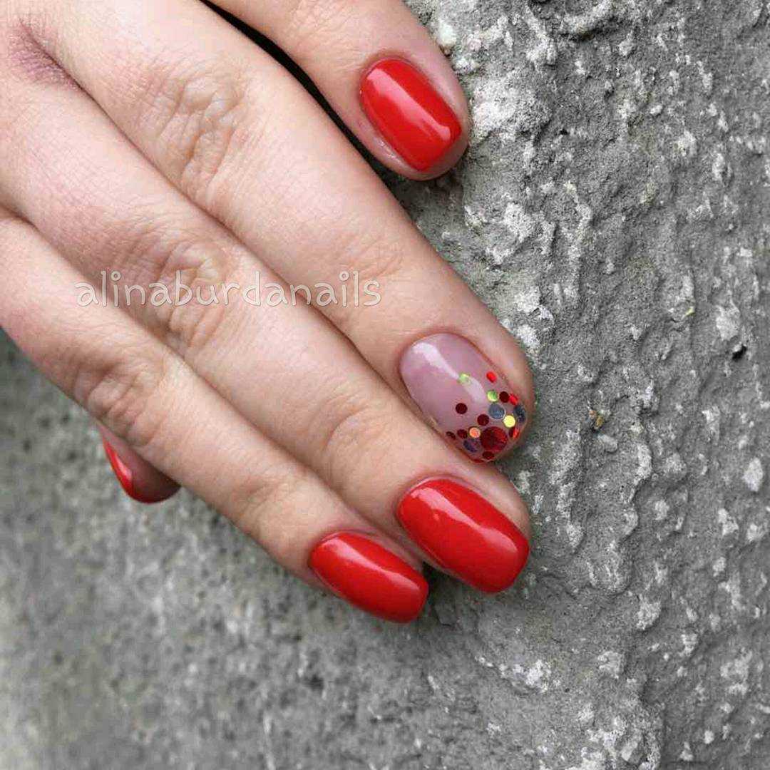 Акценты серебристого или золотого цвета на красном легко сделать глиттером, шиммером или фольгой, завоевавшей популярность из-за простоты нанесения. Нежные рисунки дополнят образ. Мастера часто прибегают к абстракции, украшенной мини-стразами, скотч-лентой.