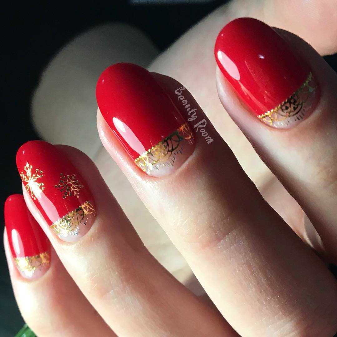 Красный маникюр с золотом уже заслужил свое место в праздничной классике. Красный цвет с золотом — роскошное сочетание. Однако, минимальное количество золота в декоре делает его более строгим. Такое оформление подходит для ежедневной носки и сочетается как, с глянцевым, так и с матовым покрытием.