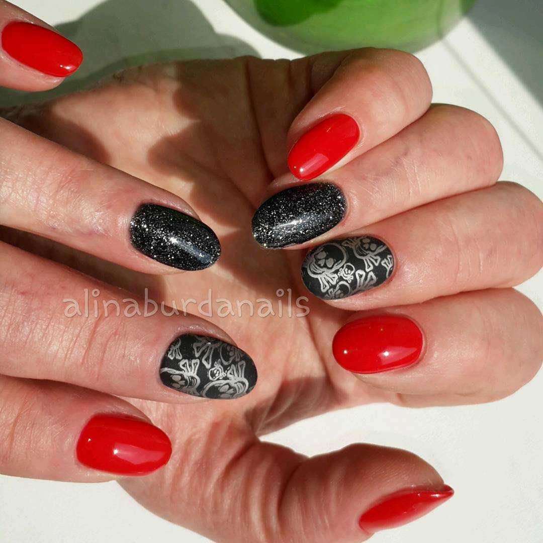 Красные ногти с черными вензелями, серебряным глиттером и мини-стразами