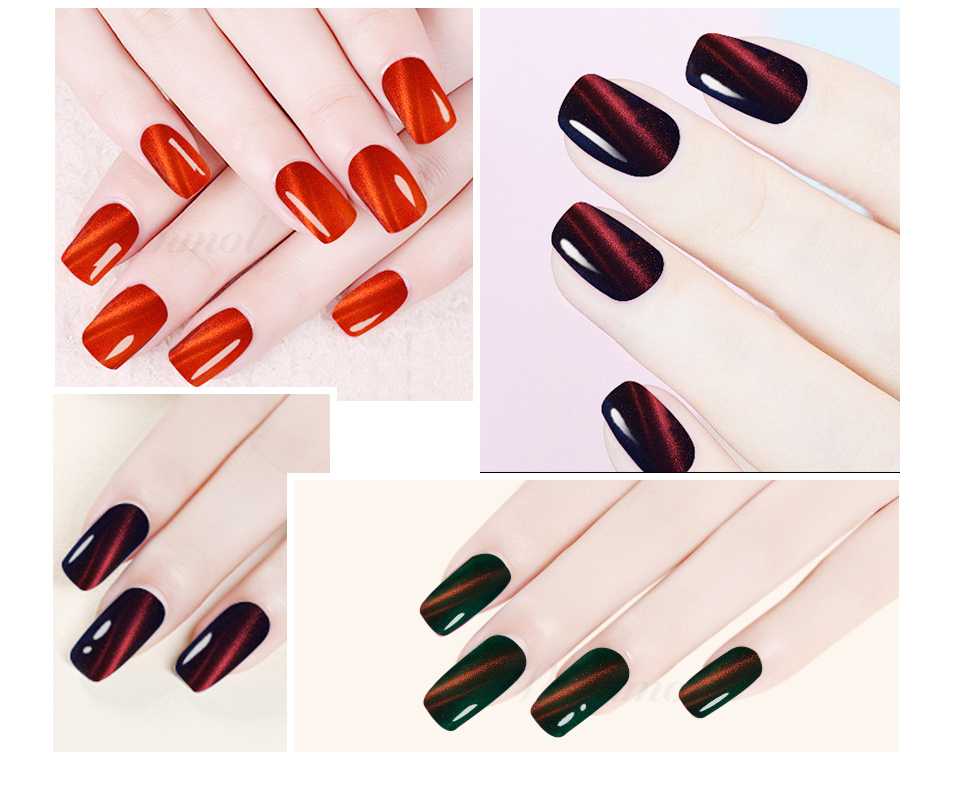 “Мокрый”. Довольно необычная техника нанесения гель-лака “кошачий глаз”. Ее особенность заключается в том, что цветная основа наносится не в один слой, а в два. При этом второй сразу не полимеризуется. На него ставится капля магнитного покрытия, а после прикладывается магнит, дабы сформировался блик.