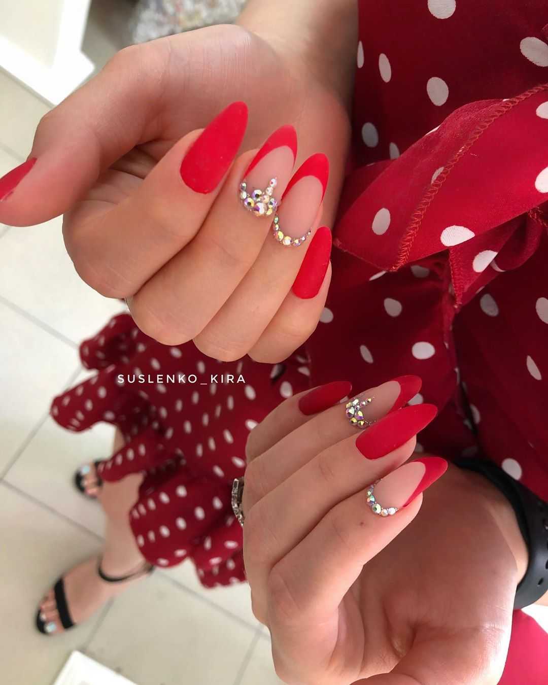 - Красный френч по линии отросшего ногтя, украсив лунку синими стразами.