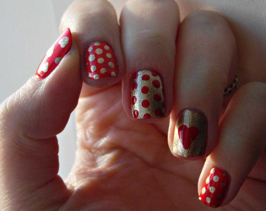 - На ноготь на безымянном пальце наклеивают трафарет в виде сердца, который имеет только контур. Все пространство вокруг сердца закрашивают красным цветом, а серединку выкладывают золотыми пайетками. Когда лаковое покрытие полностью высохнет, аккуратным движением нужно снять трафарет. Все ноготки покрывают закрепителем.