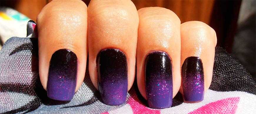 Фиолетовому цвету глиттер придаст нотки торжественности и шарма