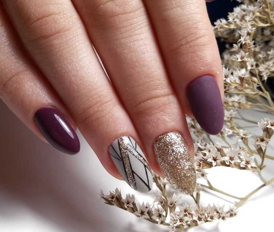 Однотонный маникюр сливового цвета – готовый дизайн для тех, кто любит универсальность и простоту. А тот, кто захочет немного поэкспериментировать, вот несколько идей, как можно его разбавить: