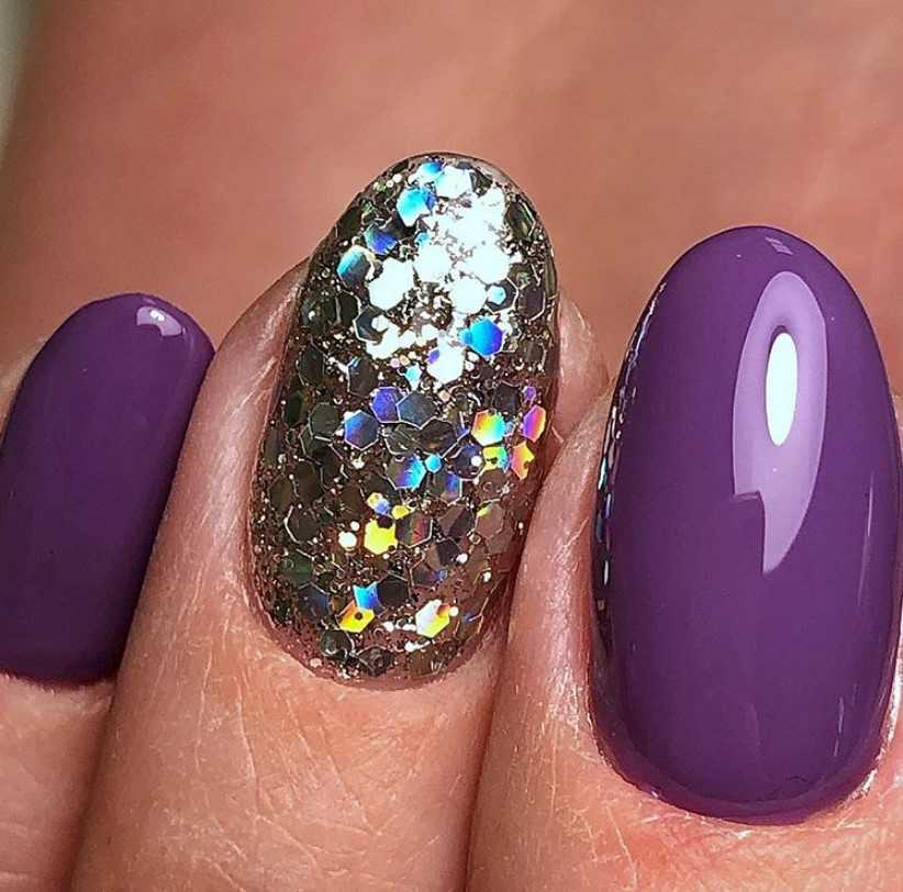 - однотонное покрытие ногтей фиолетовым гель-лаком и серебряным глиттером – глиттер чаще всего располагается на безымянном пальце