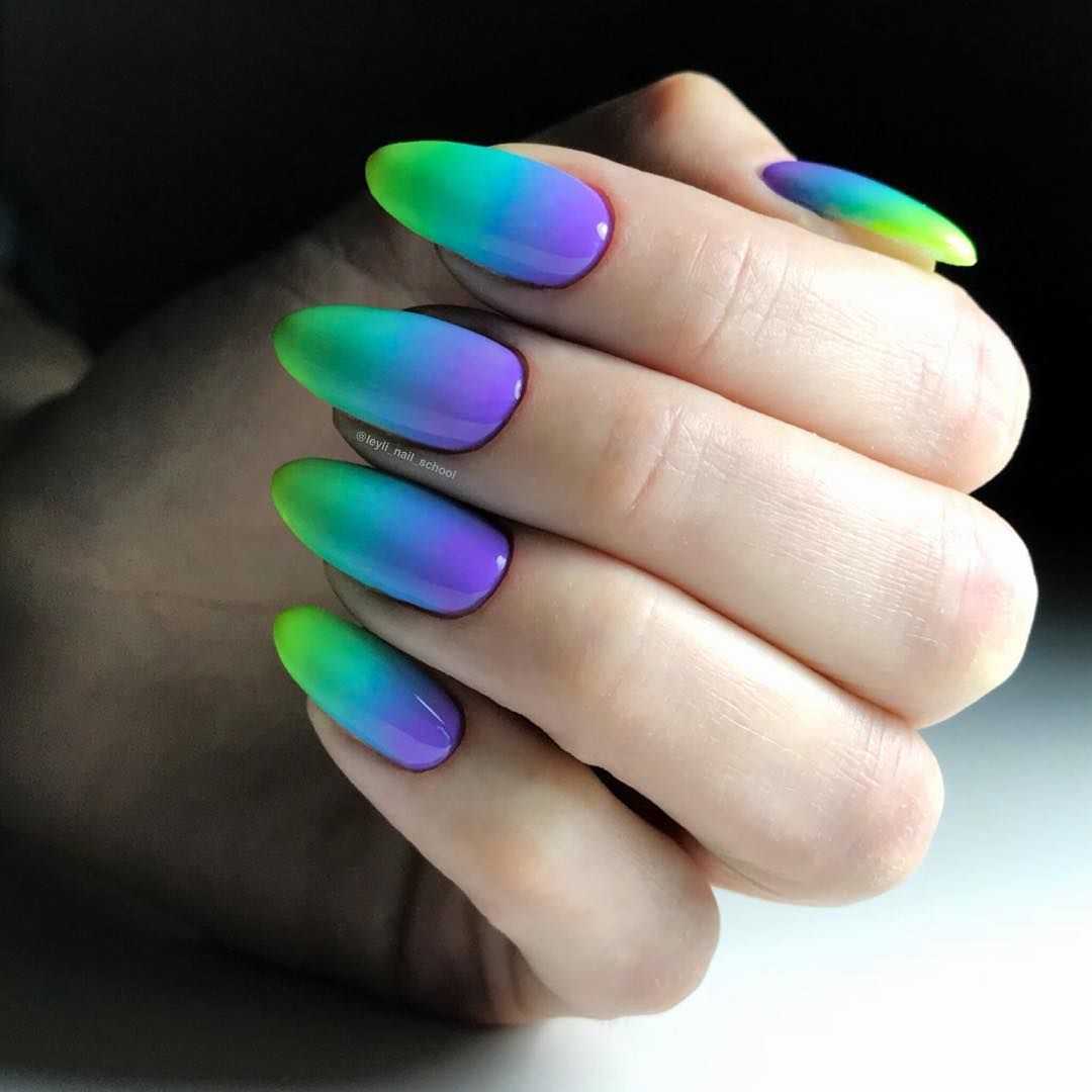 Зелёный. Черно-зелёный или жёлто-зелёный градиент – выбор женщины, ценящей свободу и смелость. Яркий дизайн не требует дополнительного декора, поскольку сам по себе сразу становится изюминкой образа.