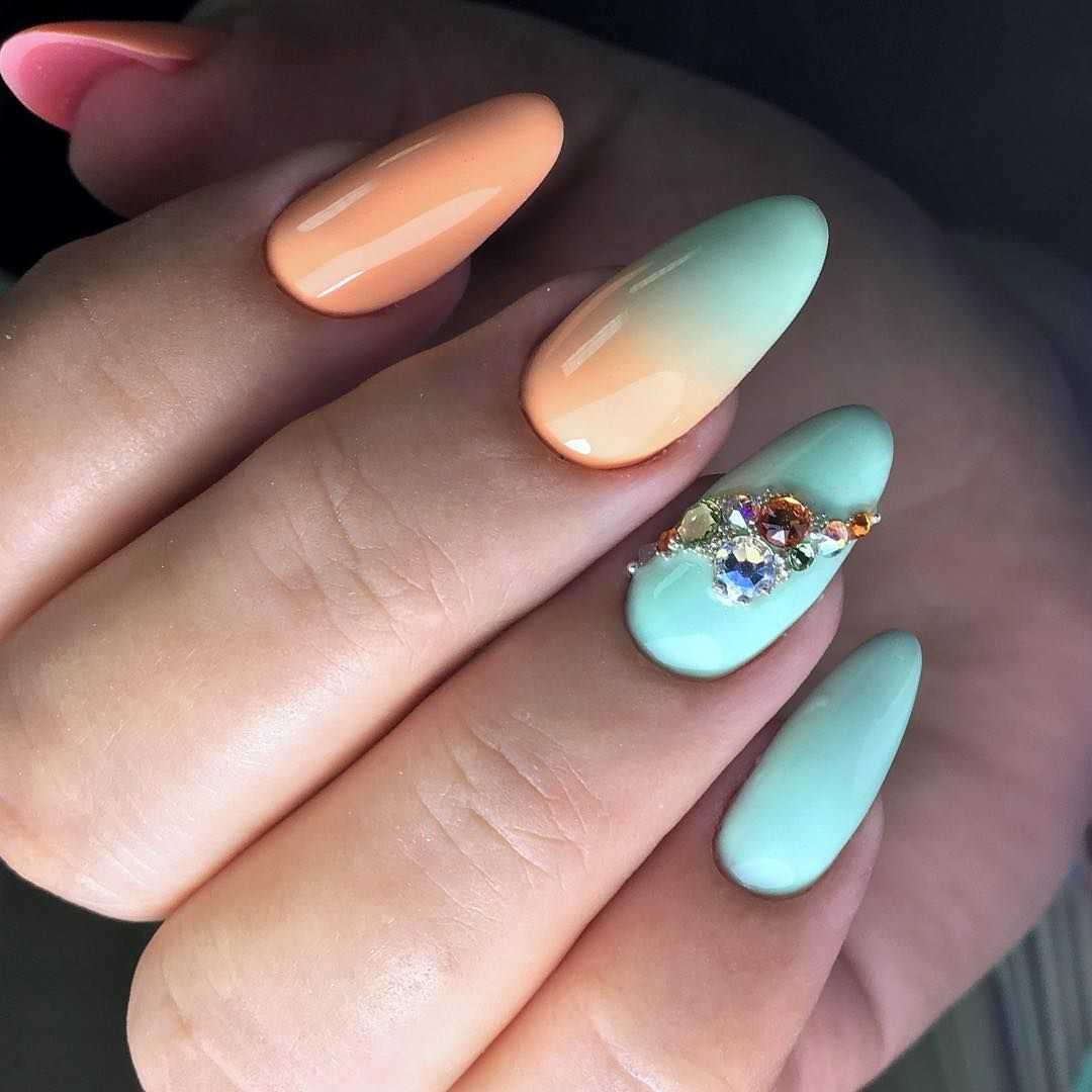 Что касается оттенков, то на первых этапах работы с дизайном омбре рекомендуется использовать светлые тона. Их легче растушевать и убрать границы между оттенками. По мере освоения градиентного маникюра в дизайн можно добавить темные акцентные тона, декор стразами, акриловой пудрой.
