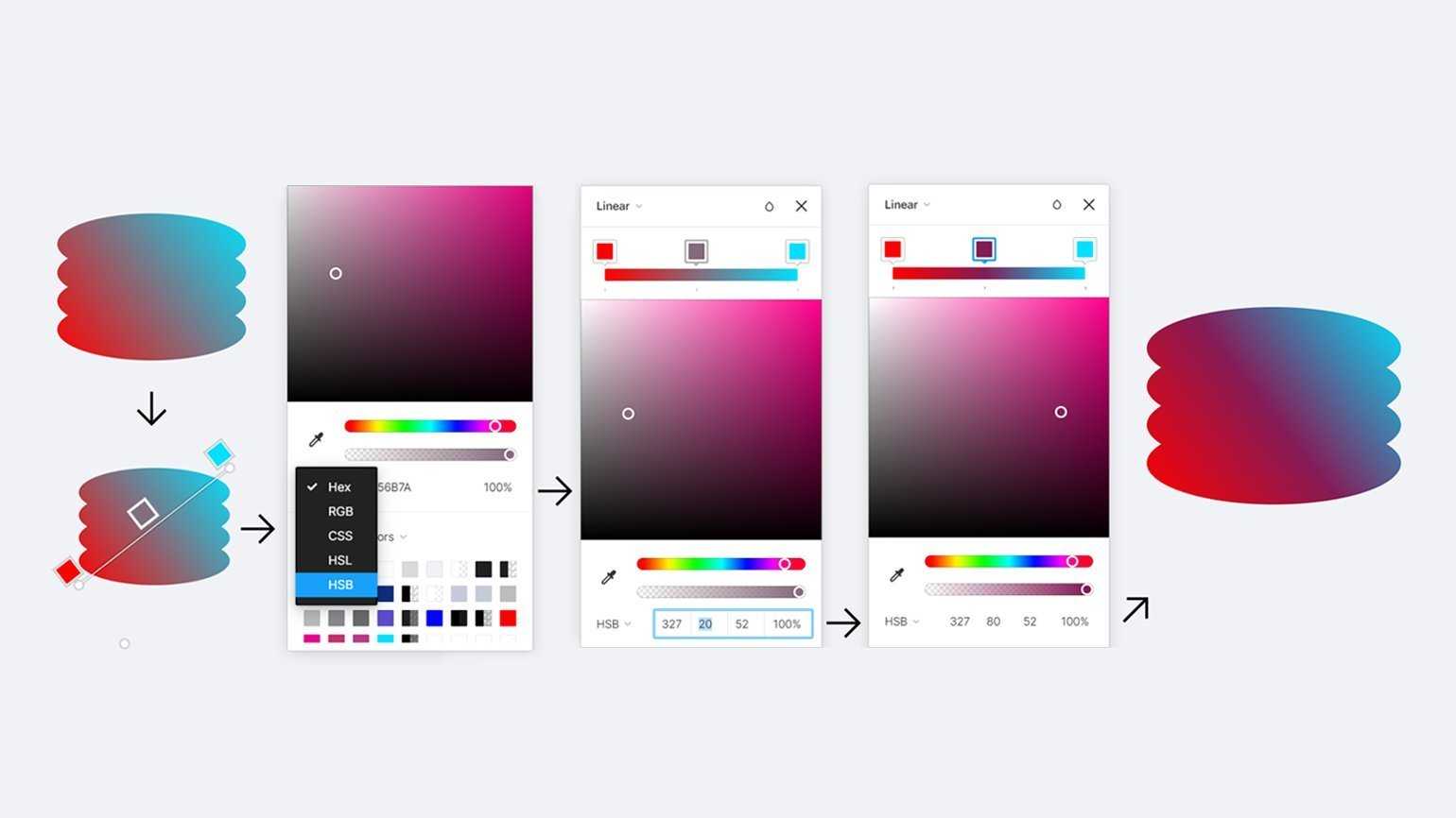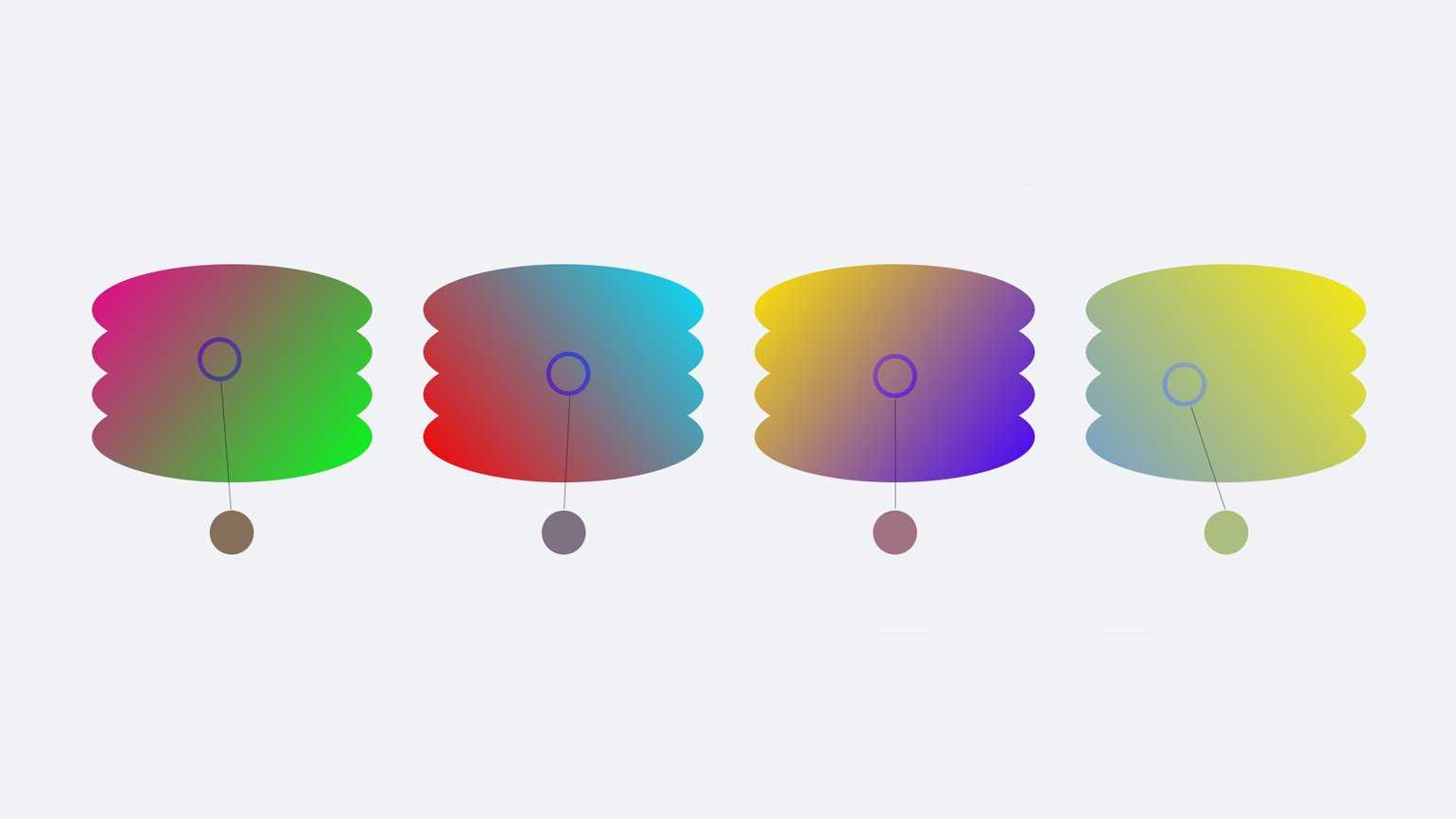 По сути, в этом случае градиент будет строиться не по прямой от одного цвета к другому, а с использованием промежуточных точек ближе к краям цветового круга.