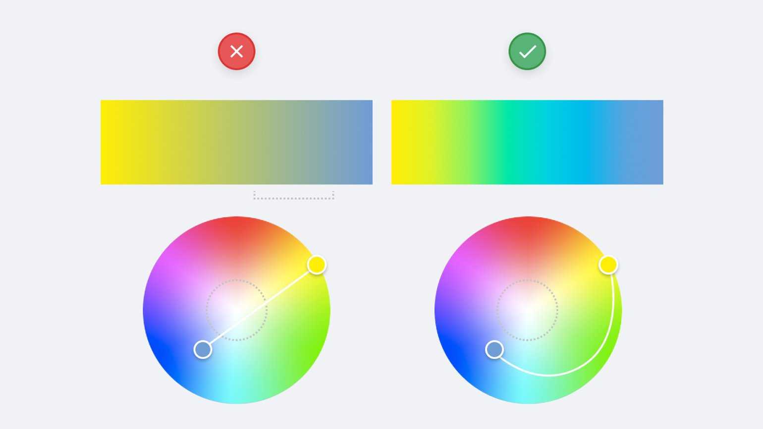 Раз проблема грязных градиентов связана с устройством RGB, то можно воспользоваться альтернативным цветовым пространством . Оно спроектировано с учётом восприятия цветов глазом человека, поэтому градиенты будут не только плавными, но и с понятной логикой перехода цветов.