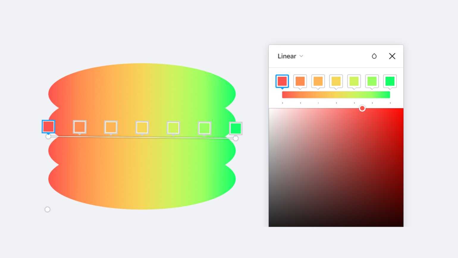 В Figma для того, чтобы расставить точки градиента на равном расстоянии, можно использовать плагин Precise Gradients. Сначала расставьте точки на случайном расстоянии, сохранив порядок цветов, затем запустите плагин и нажмите на иконку выравнивания, которая расположена в строке Gradient stops справа.
