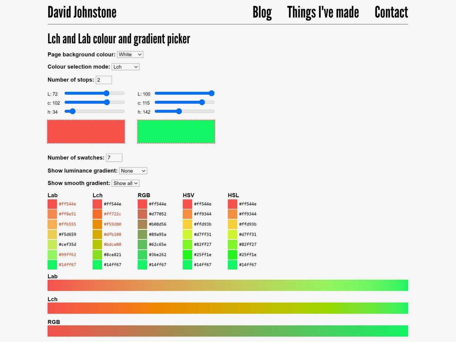 В качестве альтернативного метода создания градиента в LAB можно воспользоваться инструментом Lch and Lab colour and gradient picker Дэвида Джонстона.