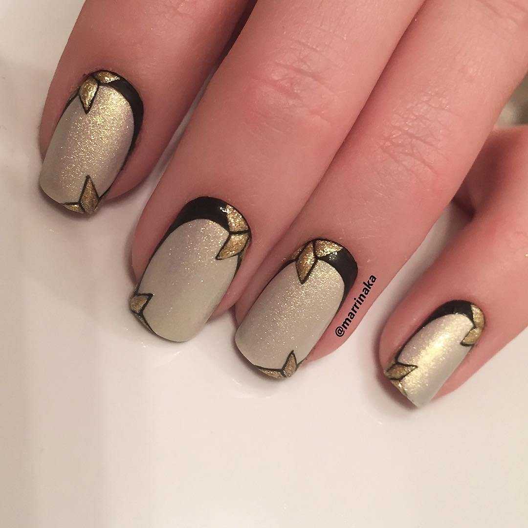 Треугольники делают с тупыми или удлиненно-заостренными вершинами. Один из трендов сезона – вершина продолжается до кончика ногтя, истончаясь в полоску. Еще один интересный ход – узкий, сильно вытянутый треугольник, на фоне негативной лунки. Их вырисовывают красками, оставляют прозрачными или выкладывают блестящими элементами.