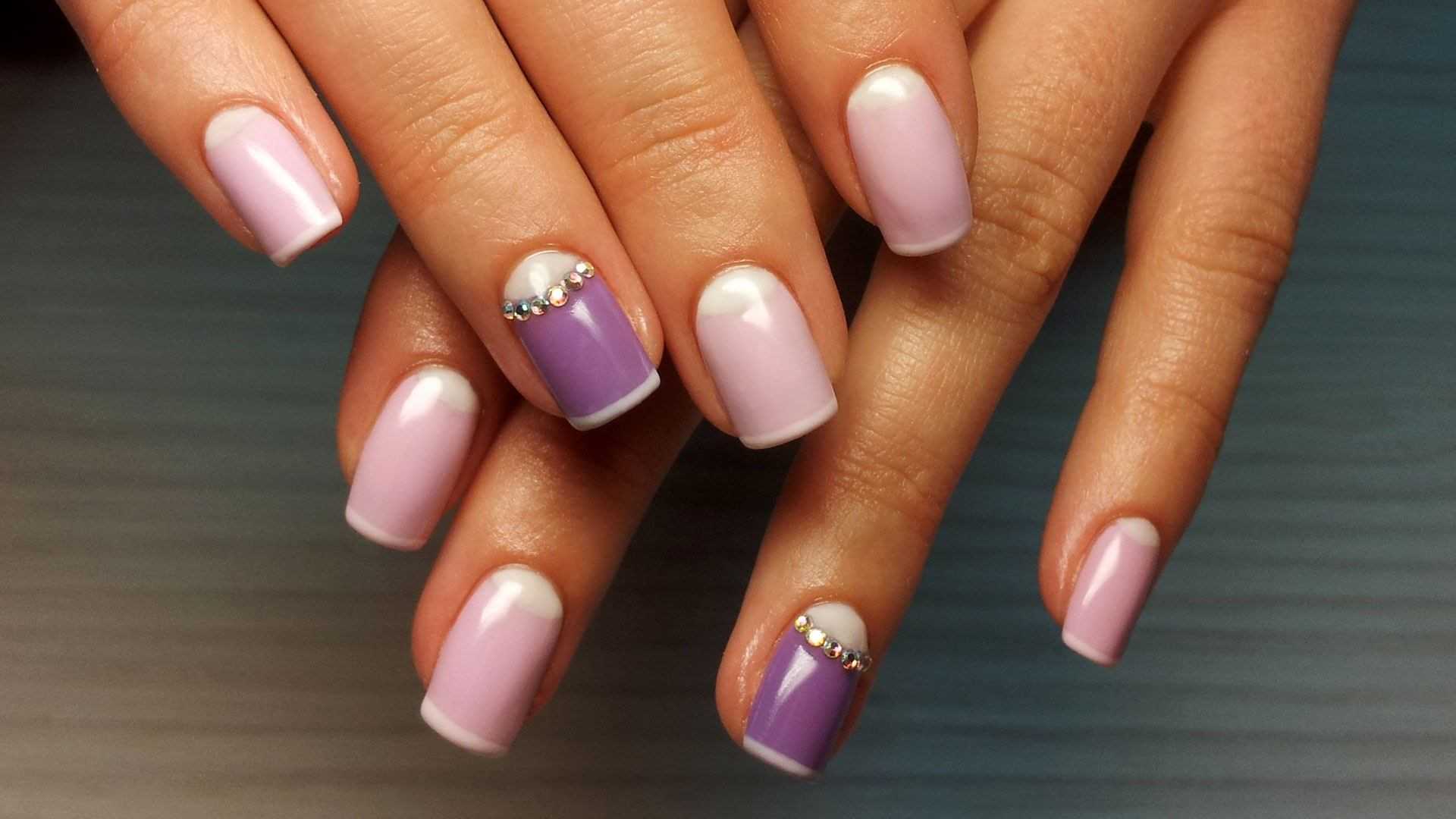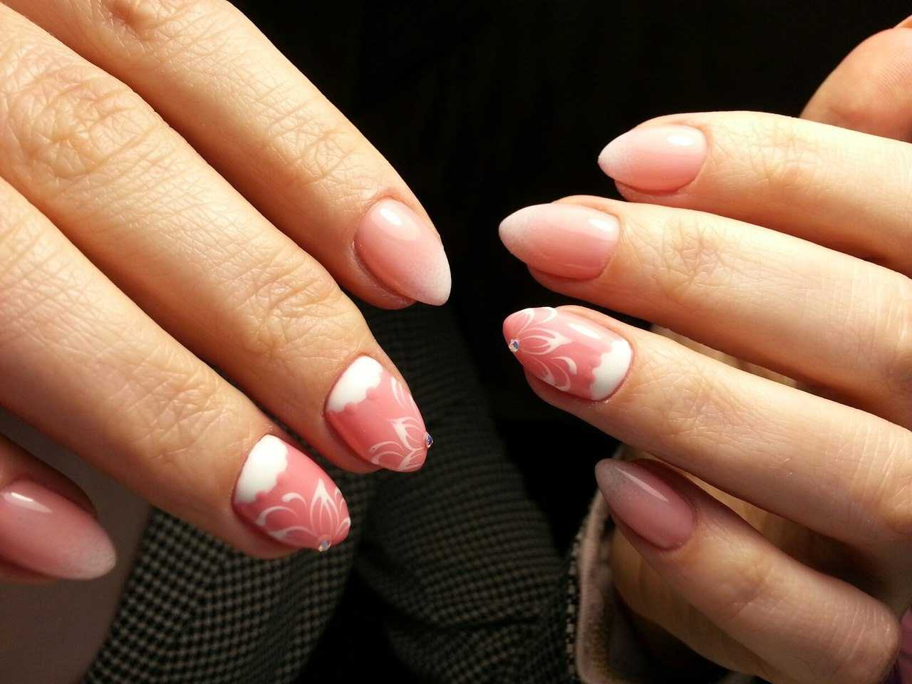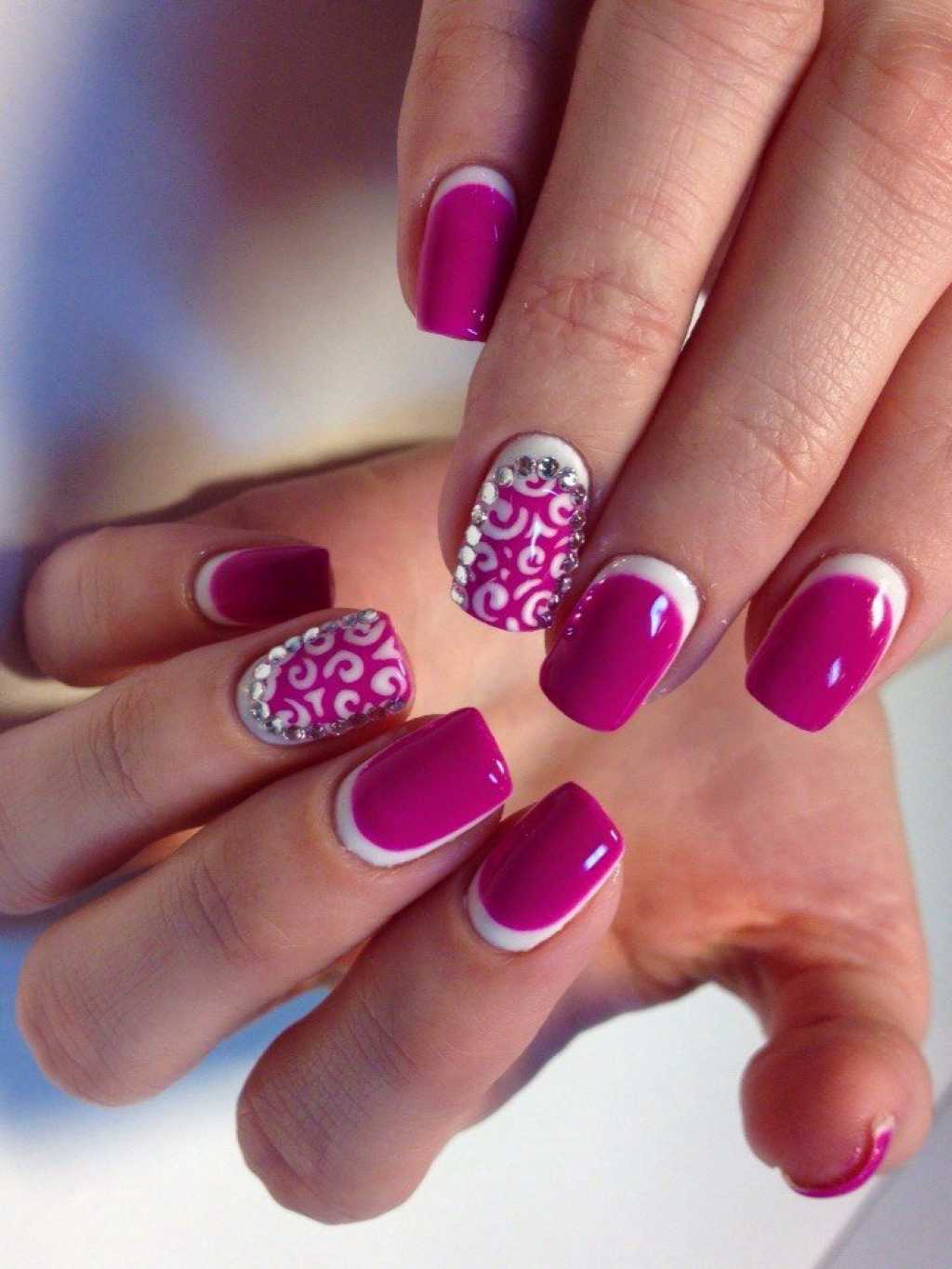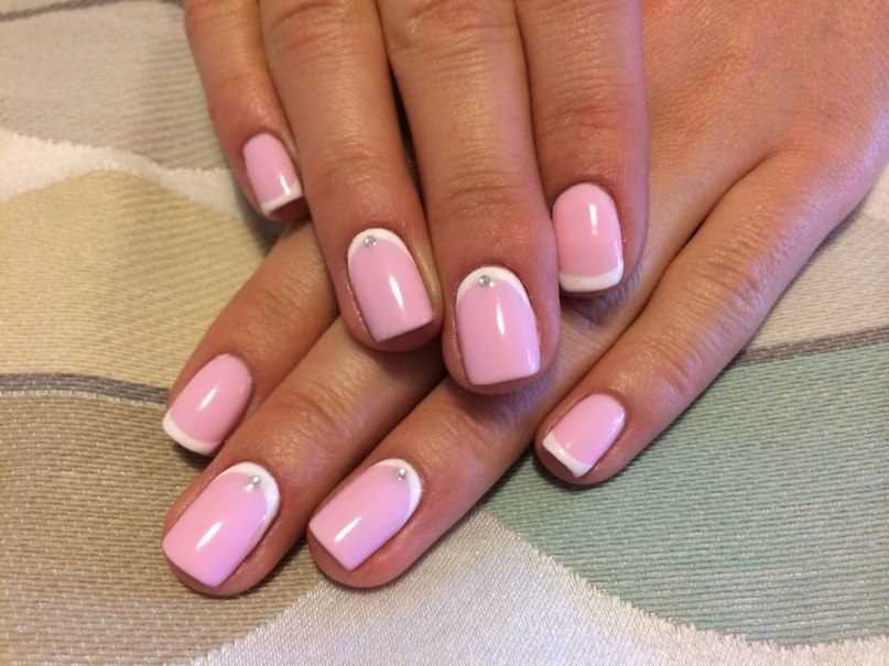 Французский маникюр становится более изысканным и оригинальным за счет того, что розовый фон украшают дополнительными белыми фрагментами. Лунный маникюр со стразами – отличный вариант праздничного нейл-арта для тех дам, которые не любят слишком броских или блестящих декорирующих элементов.