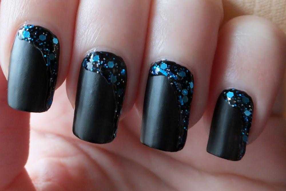 А вот черный лунный маникюр можно украсить целой россыпью блесток, особое внимание, уделяя двум или трем ноготкам