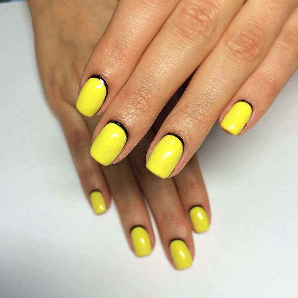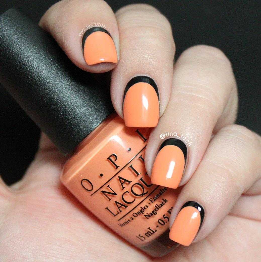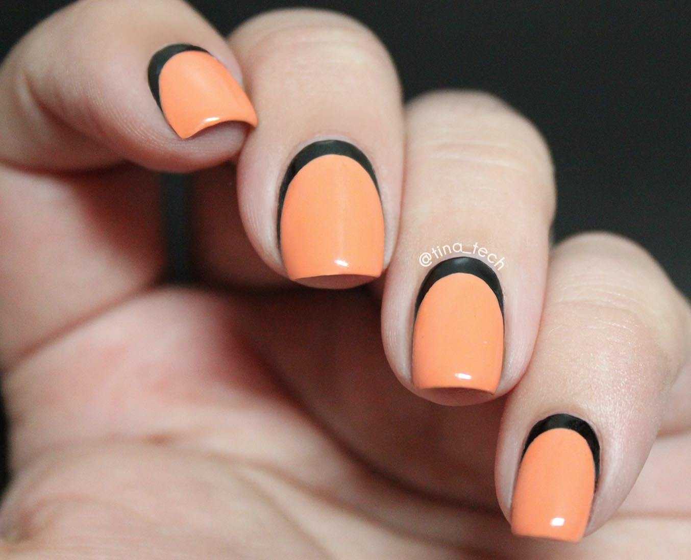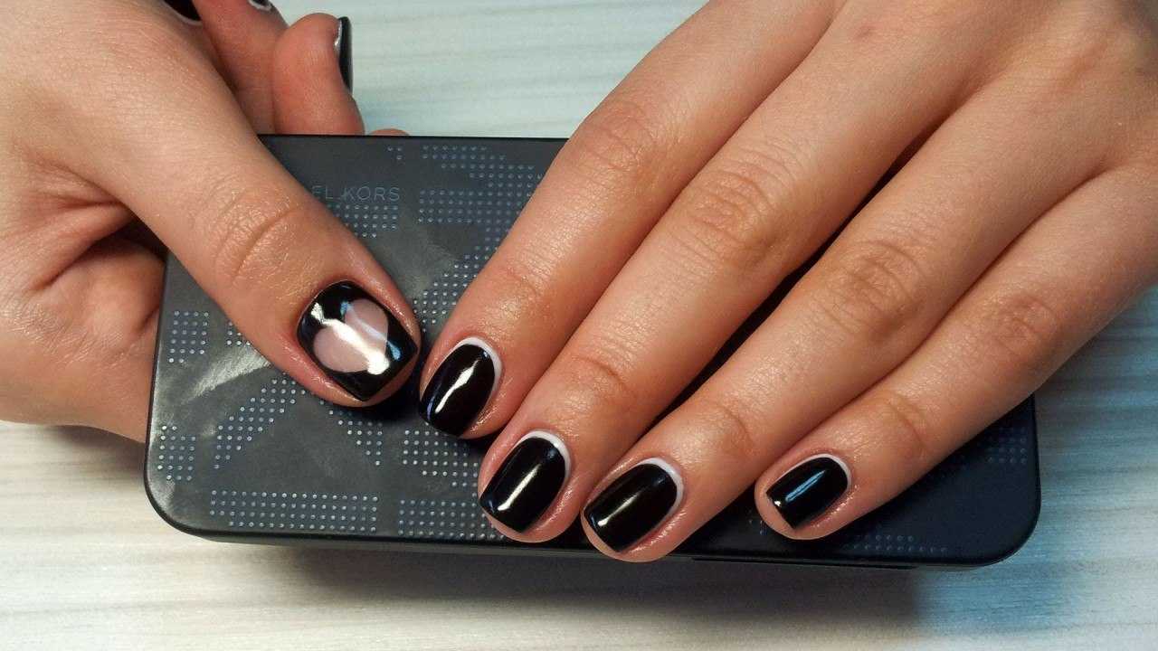 Гель лак и шеллак можно использовать, чтобы выполнить следующий дизайн ногтей. Кому-то он покажется простым, но только на первый взгляд. Бежевый цвет используется для заполнения фона, черный – для прорисовки тонкой линии у основания, которая изгибается полумесяцем и соединяет края пластины. Декор не нужен, но стоит обратить на форму – лучше, если она будет квадратной. В этом случае получится привлекательный контраст острых углов ногтя и плавной линии рисунка.