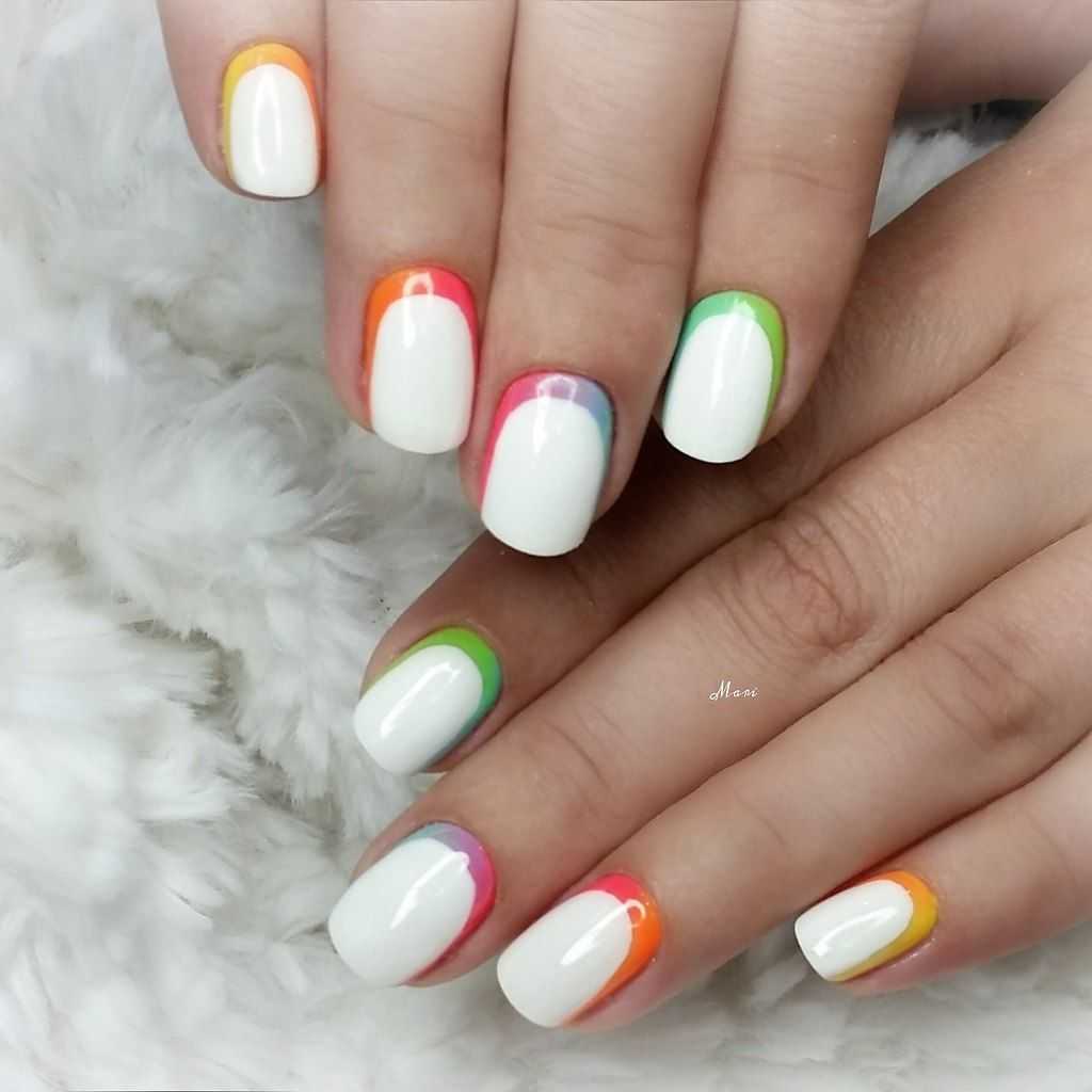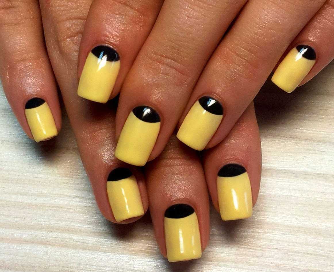 Короткие ногти – не причина, чтобы отказаться от маникюра. Симпатичный дизайн ногтей – с лунками разных цветов: коралловой, голубой, желтой и розовой, и с рисунком в виде небольших черных точек, расположенных по середине пластины в виде вертикальной линии. Будет интересно, если каждая из них будет немного отличаться по размеру: чем ближе к центру, тем меньше. Также допустим обратный вариант с крупной точкой посередине.
