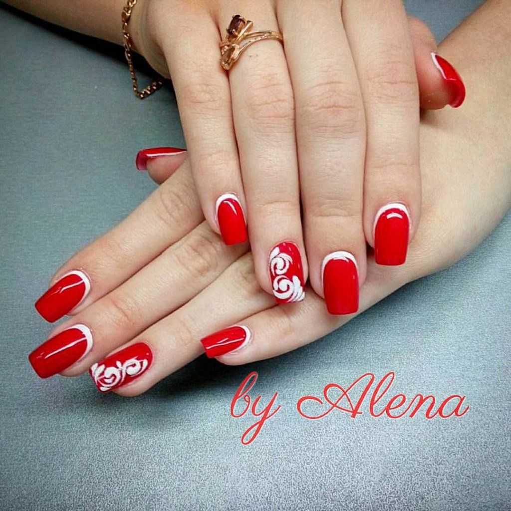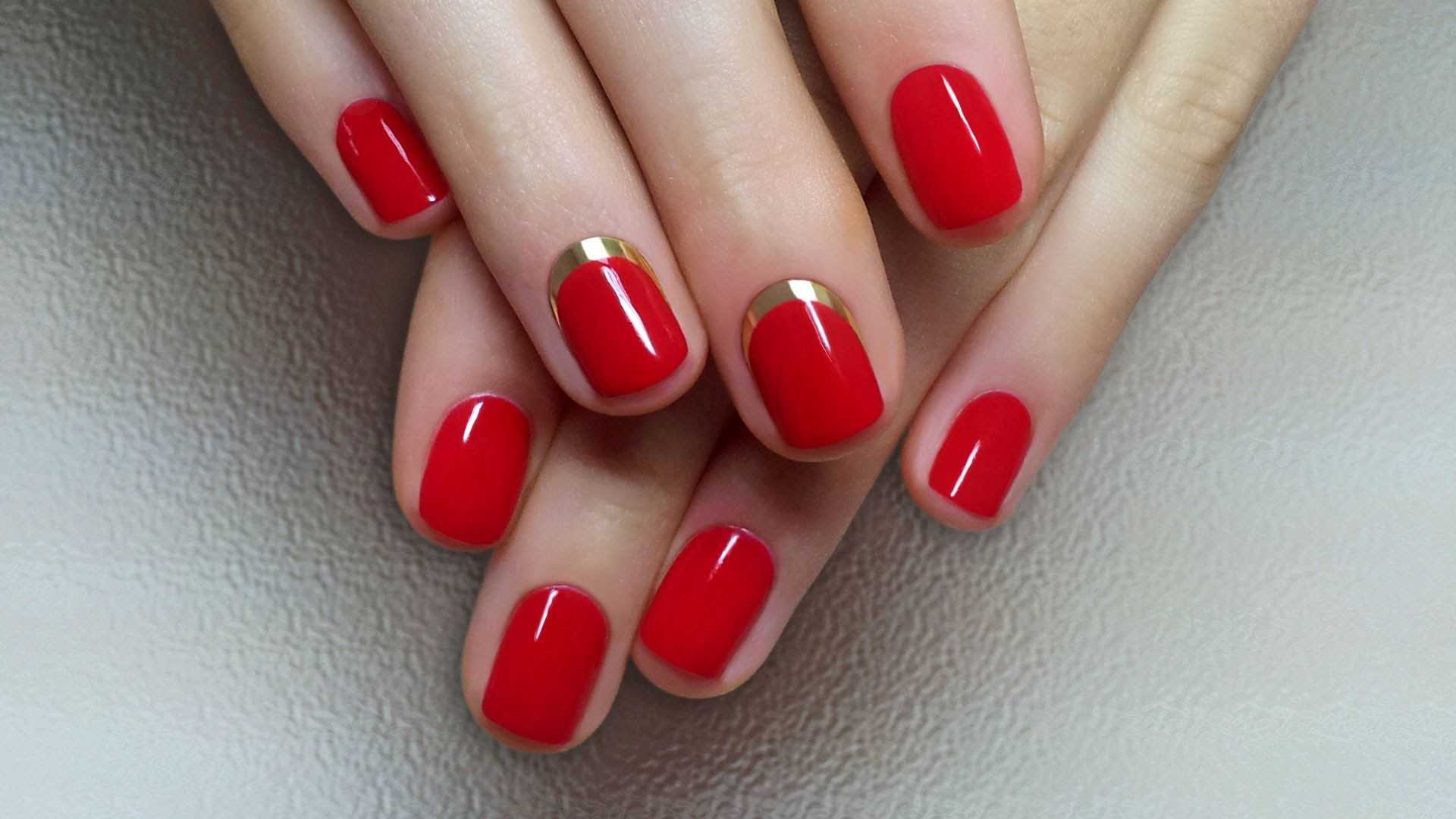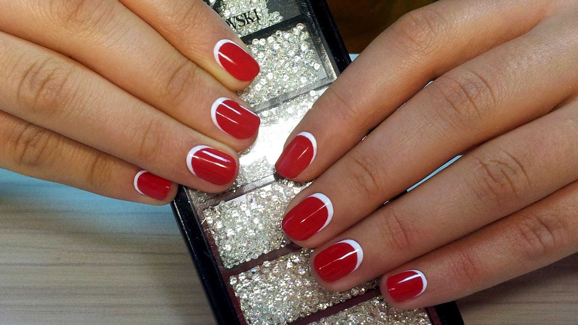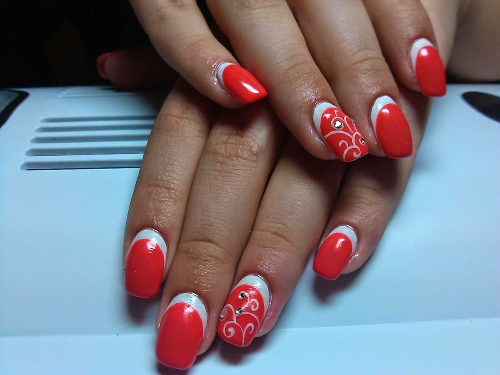 Подчеркнуть сексуальность красного лунного маникюра помогут всего несколько небольших страз, расположенных у основания ногтевого ложа
