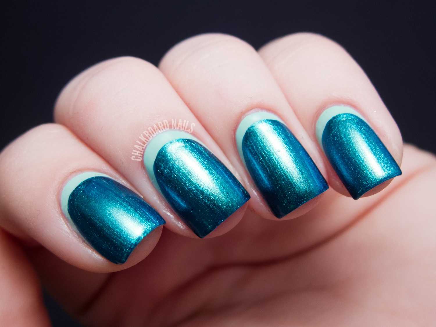 - Нанесите второй цвет — используя другой цвет лака, налейте немного на кисточку и аккуратно нарисуйте полоску над основным цветом, чтобы создать эффект луны. Дайте лаку высохнуть полностью.