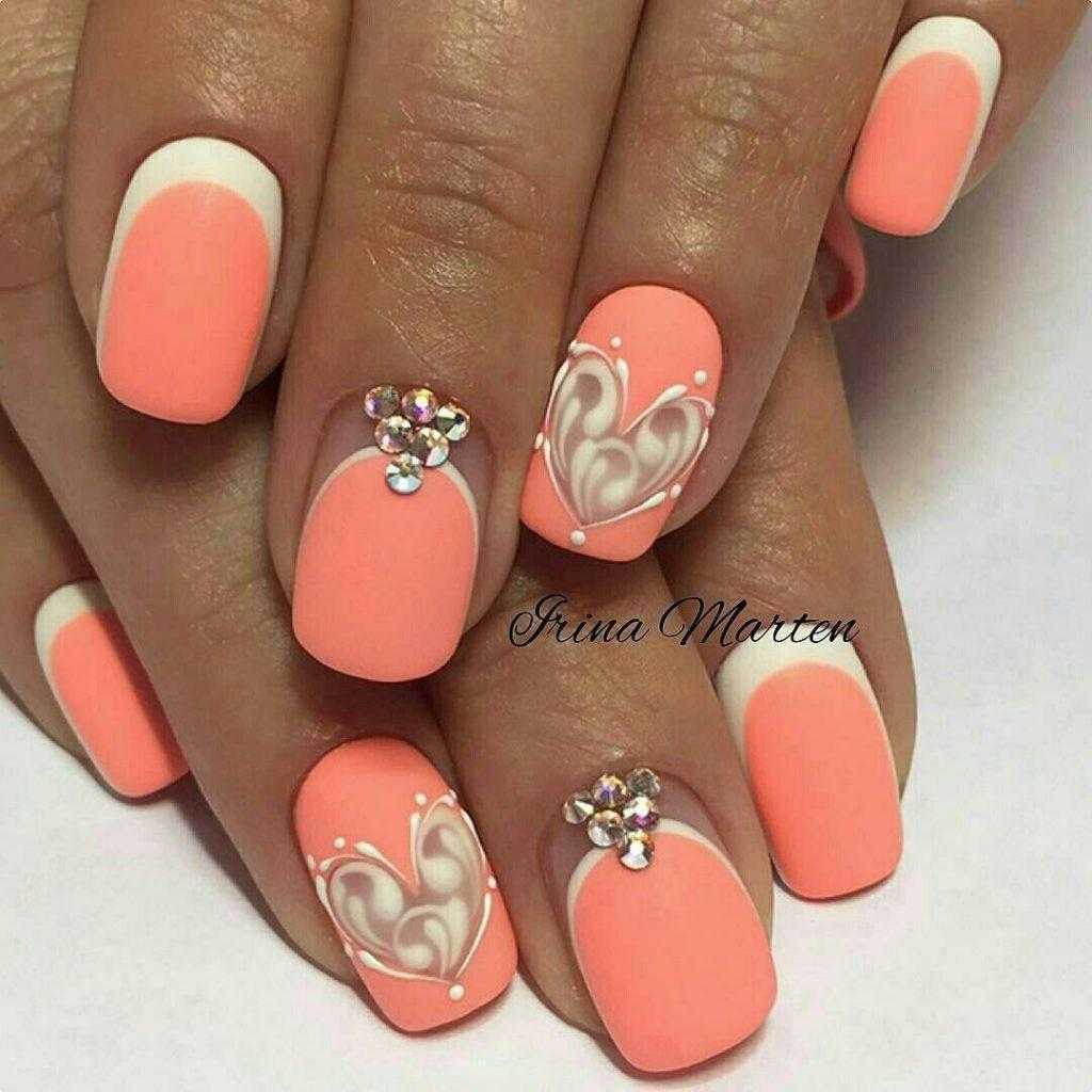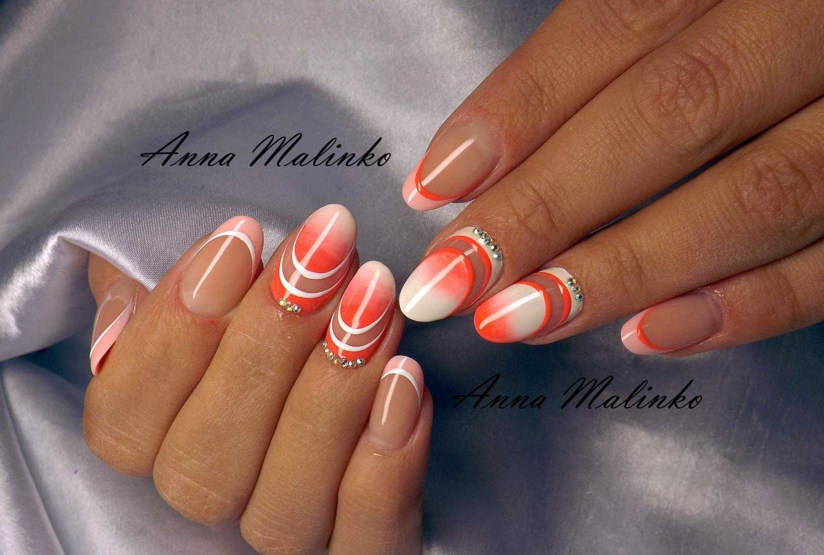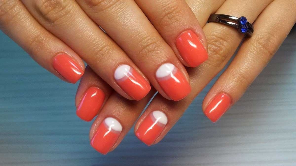 Не менее интересен вариант с коралловым фоном и белыми лунками. Его также не стоит украшать стразами или блестками – они будут лишними и сильно упростят идею. Такой маникюр будет неплохо смотреться с деловым костюмом соответствующего цвета и понравится женщинам, работающим в офисе или занимающим высокую должность. В 2022-2023 делается акцент на лаконичность, что проявляется в минимальном использовании декора.