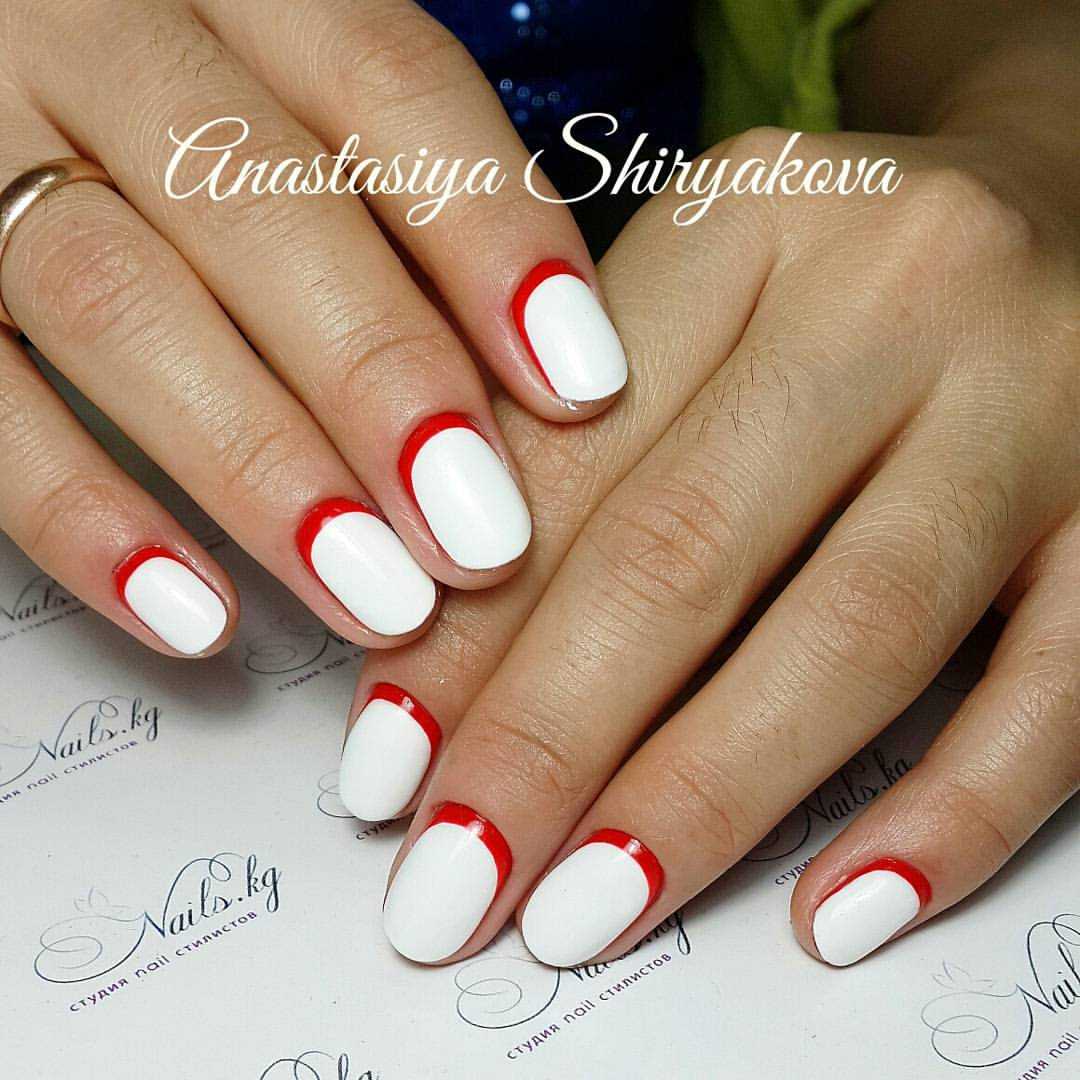Получил названия «антифренч», «обратный френч». Особенность такого маникюра в том, что форма углов луны более вытянутая, расходится по бокам ногтя от лунки.