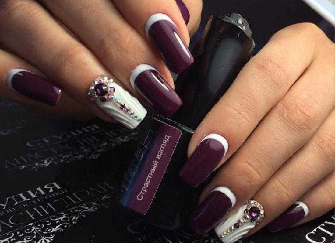 Другой красивый вариант – геометрия. Вместо классических лун у основания прорисовываются квадраты, расположенные по центру. Их можно заполнить серебряным лаком и обвести черным, чтобы сформировать контур и добавить графичности. Лучшим фоном в данном случае станет насыщенный фиолетовый цвет в глянцевом и матовом вариантах. Первый выбирается для пластин без дизайна, второй – с дизайном.