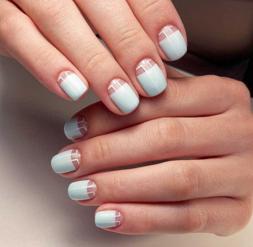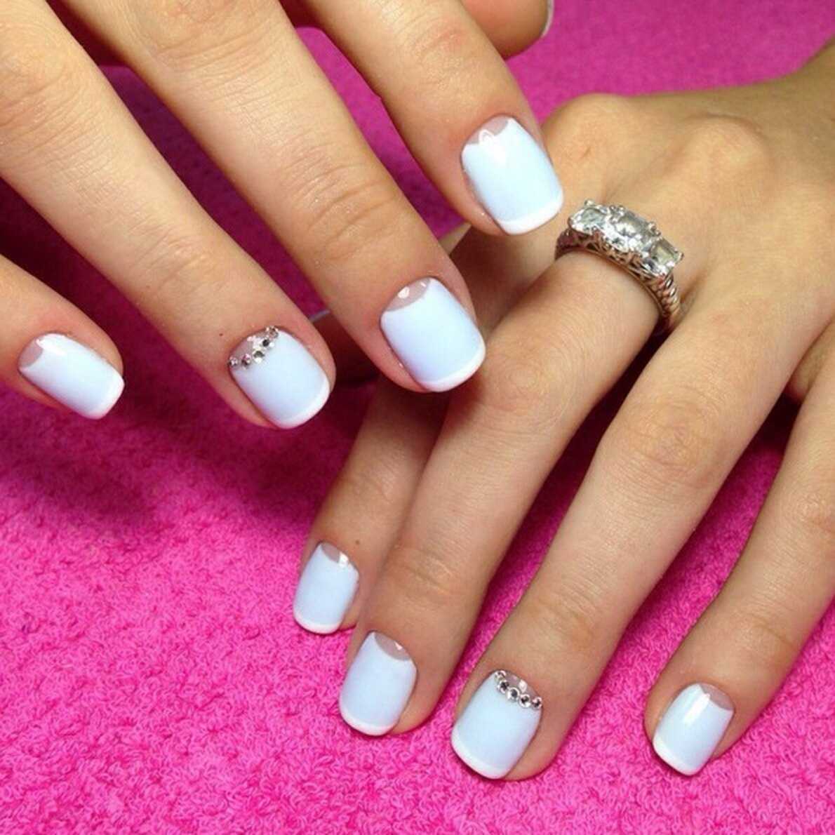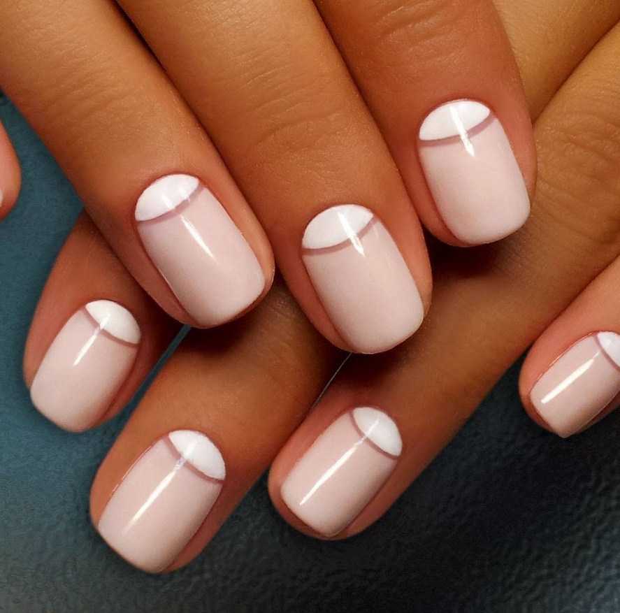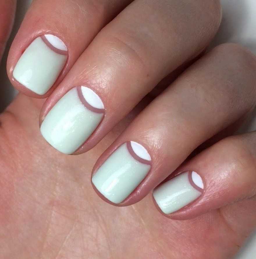 Дуги делают контрастными или просто белыми, при этом в качестве дополнения к ним размещают стразы, мелкие рисуночки. Подходящие оттенки покрытий для коротких ногтей – зелёные, розовые, жёлтые, нюдовые, голубые.
