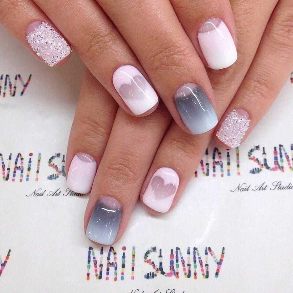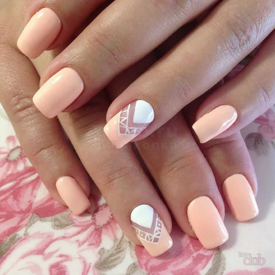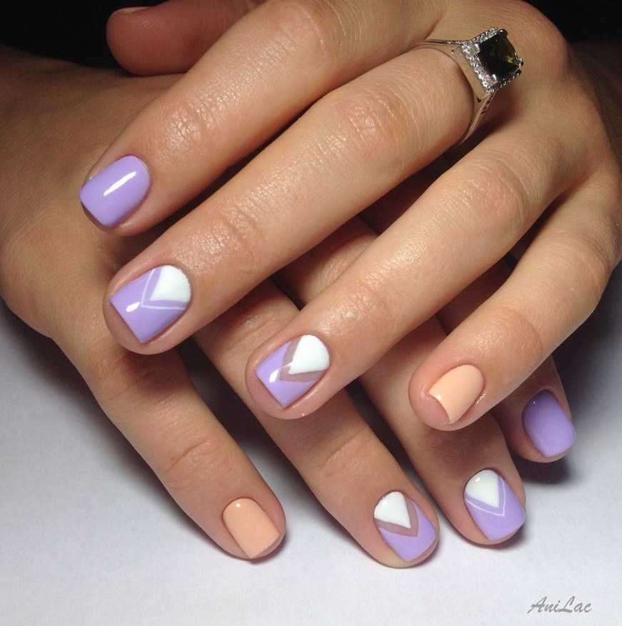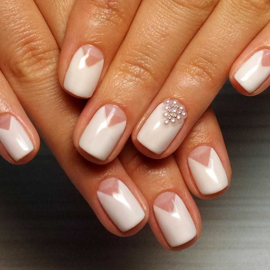 Дуги делают контрастными или просто белыми, при этом в качестве дополнения к ним размещают стразы, мелкие рисуночки. Подходящие оттенки покрытий для коротких ногтей – зелёные, розовые, жёлтые, нюдовые, голубые.