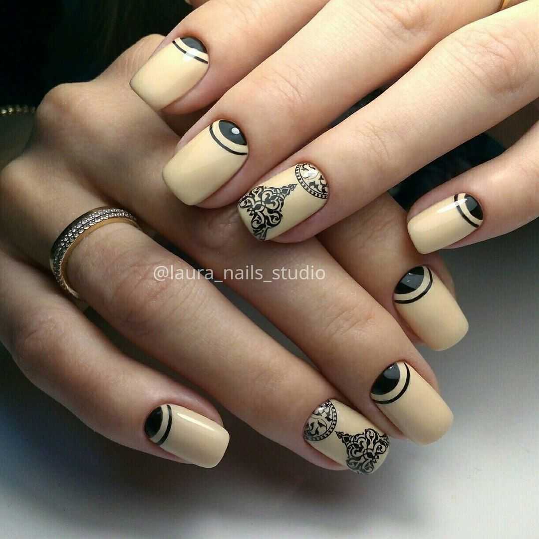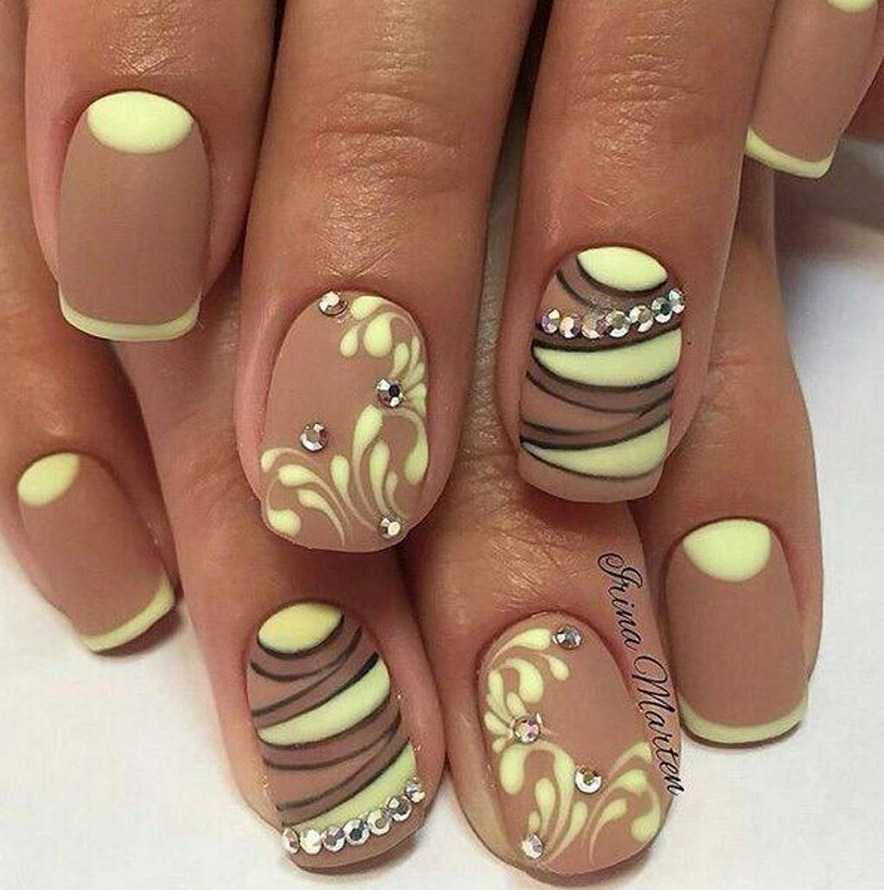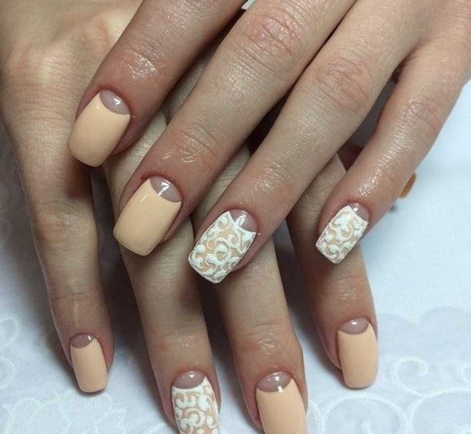 Бежевый. Красивейшие варианты лунного нейл-арта можно создавать с помощью бежевого и других оттенков нюдовой гаммы – от кремового до темно-карамельного. Такой дизайн уместен в офисном стиле, в образе невесты, особенно, с добавлением декора из стразов, камней, втирки, бульонок, блестящих конфетти.