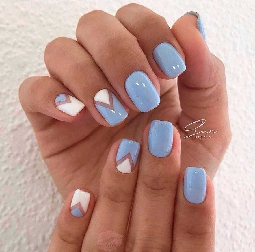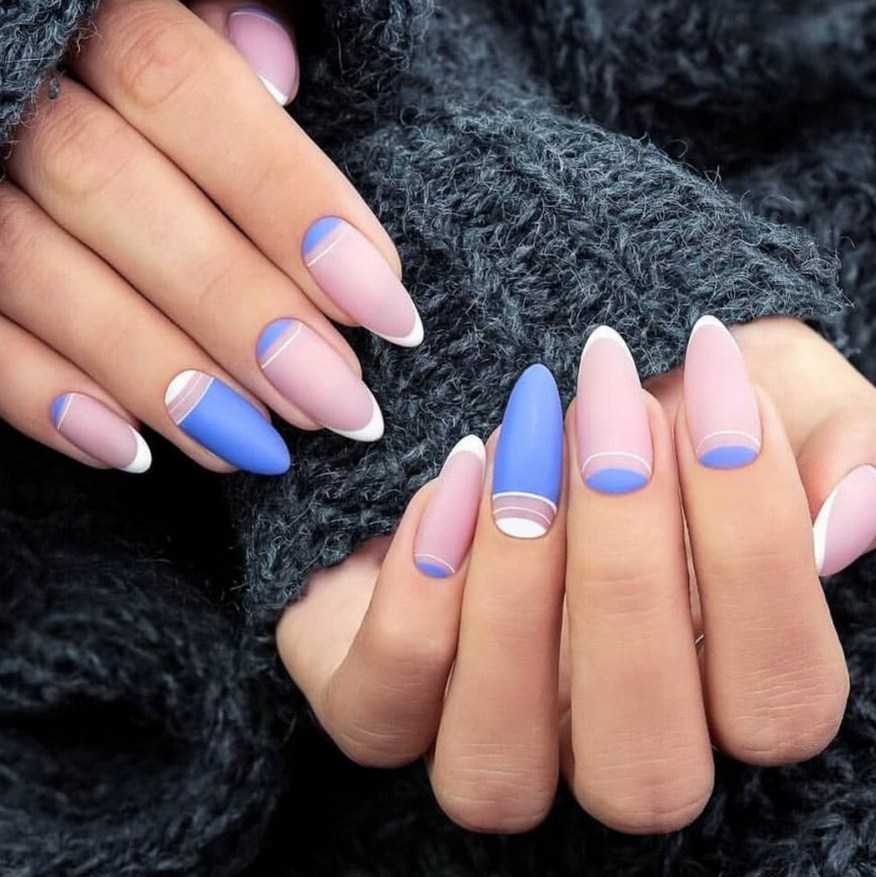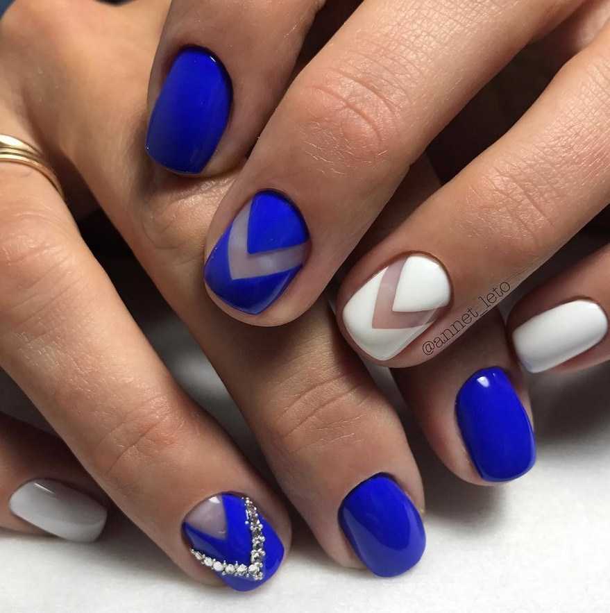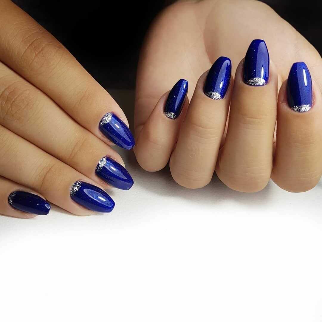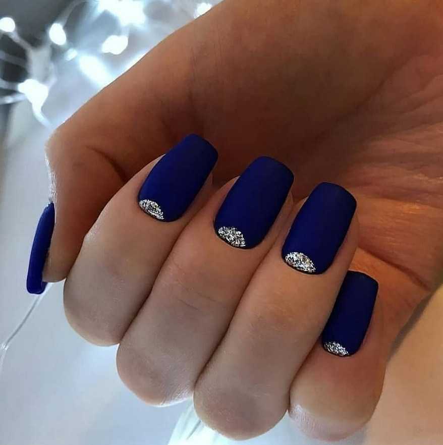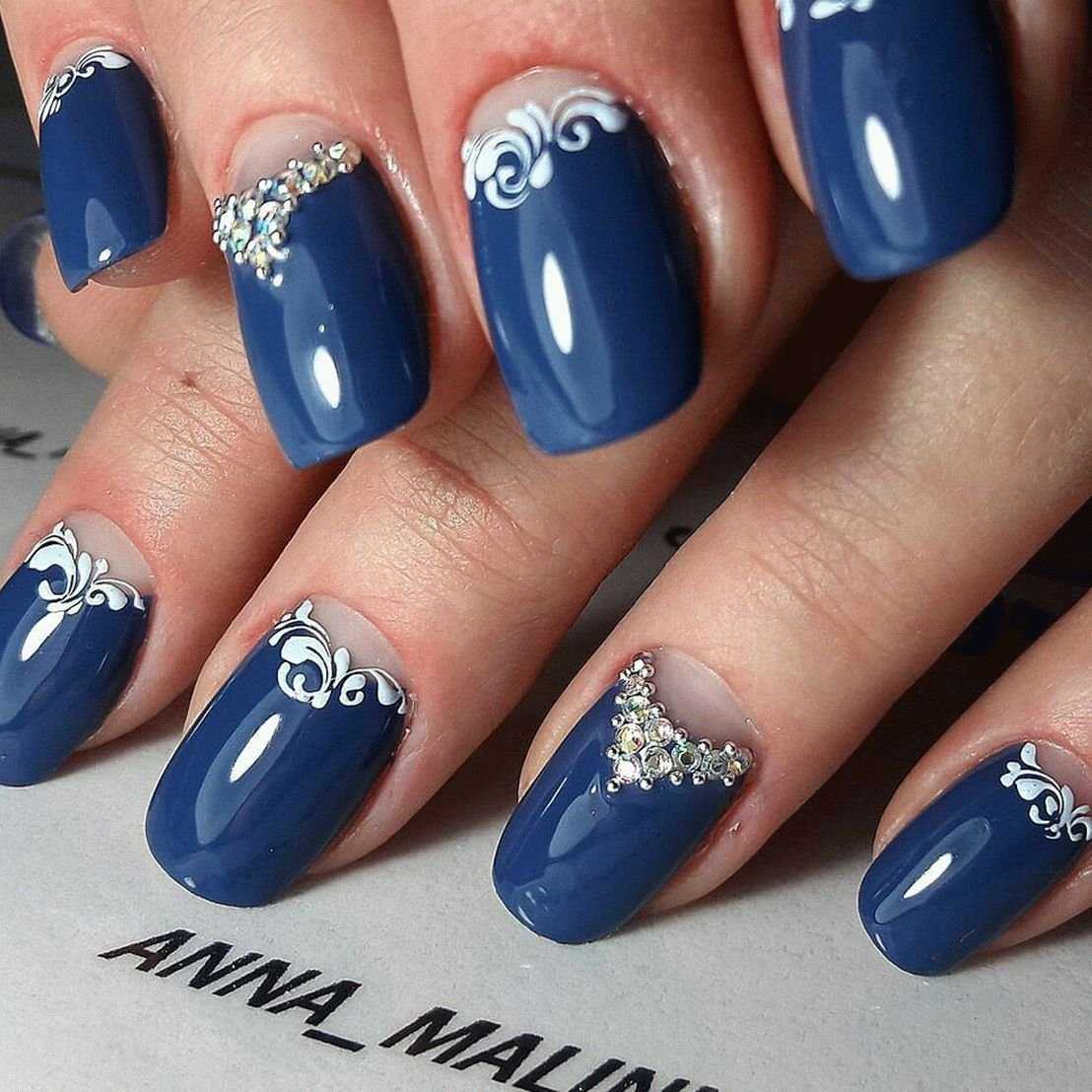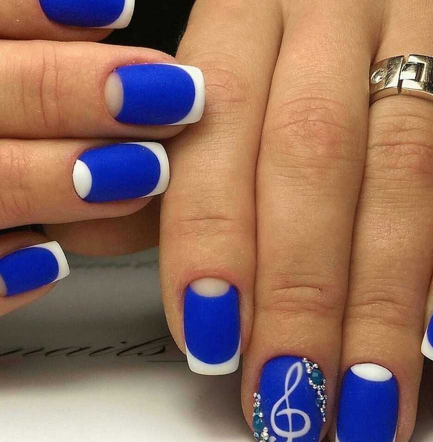 Синий. Все оттенки синего великолепны в техниках омбре и градиент, могут комбинироваться с мятными, розовыми, небесными цветами. Также все указанные оттенки можно чередовать на разных пальчиках. Нейл-арт синего оттенка делают с лунулами, выкрашенными белым, серебряным, золотым лаком, а также дополняют стразами и втиркой.