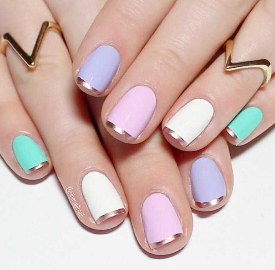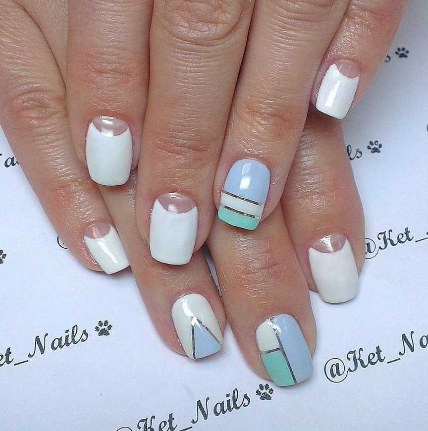 Пример такого маникюра: белоснежные ногти, лунки разных летних цветов (сиреневый, мятный, розовый), объединяет композицию телесная полоса.