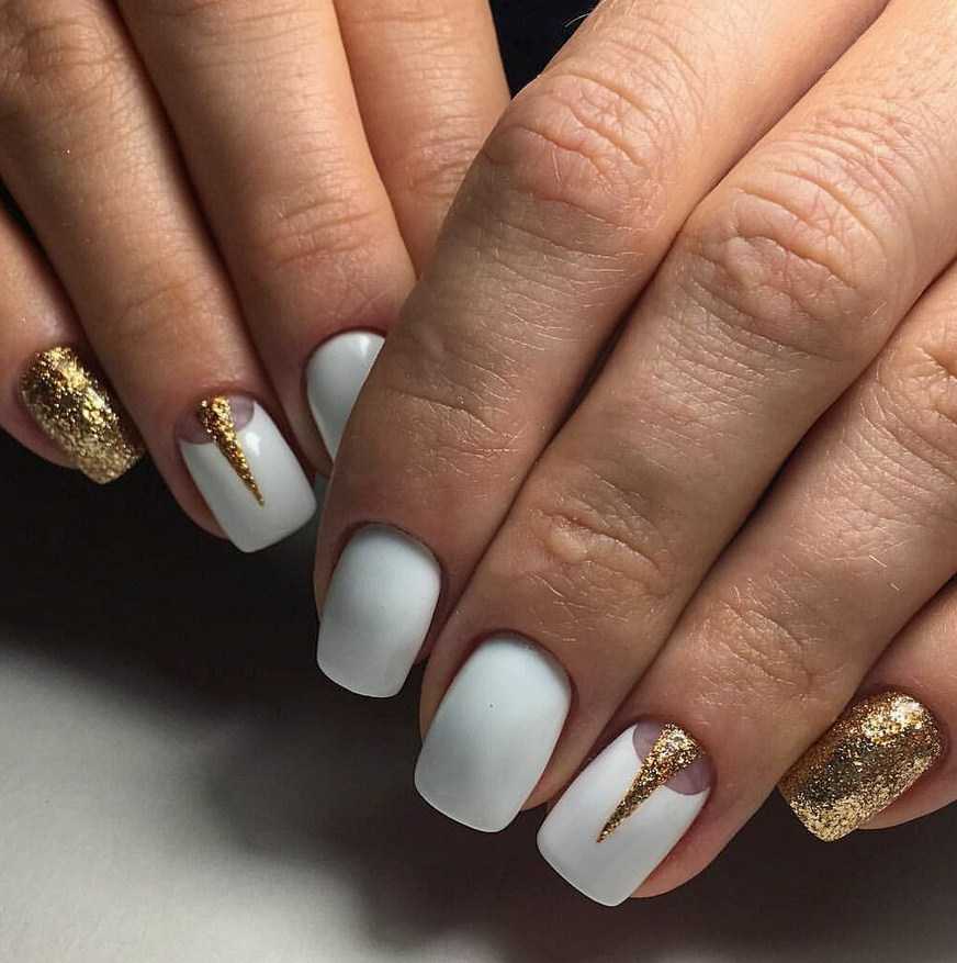 Что такое лунный дизайн в классическом понимании, знает каждая модница, но новинки нейл-арта последнего сезона сильно отличаются от стандартных форм и видов оформления. Самые дерзкие девушки предпочитают выбирать стильные треугольные лунки. Их выделяют цветом или оставляют бесцветными, покрывая прозрачным лаком. Для разбавления строгой геометрии у основания ноготков добавляют блёстки или жидкий глиттер.