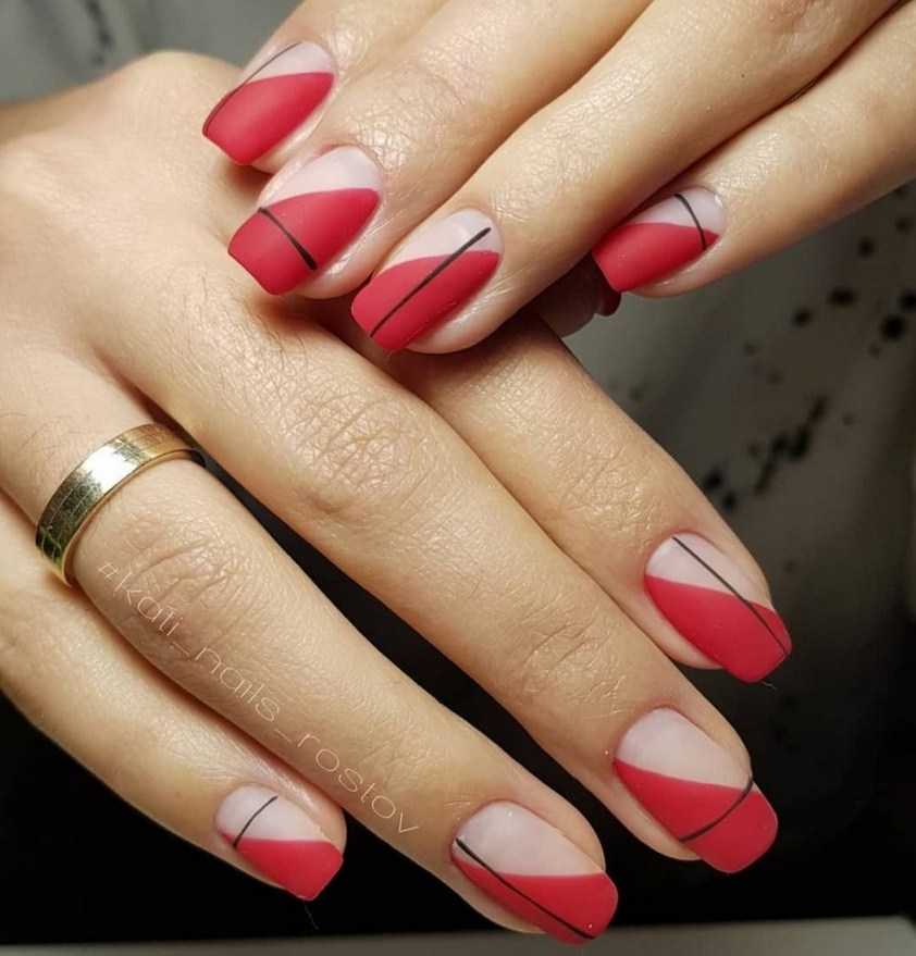 Ансамбль красного и чёрного по праву признаётся наиболее удачным. Сочетание двух цветов в новом сезоне вызывает не агрессию, а неподдельный интерес. На длинных ногтях это сочетание зачастую смотрится дерзко. Особенно, если использовать глянцевую фактуру лака.