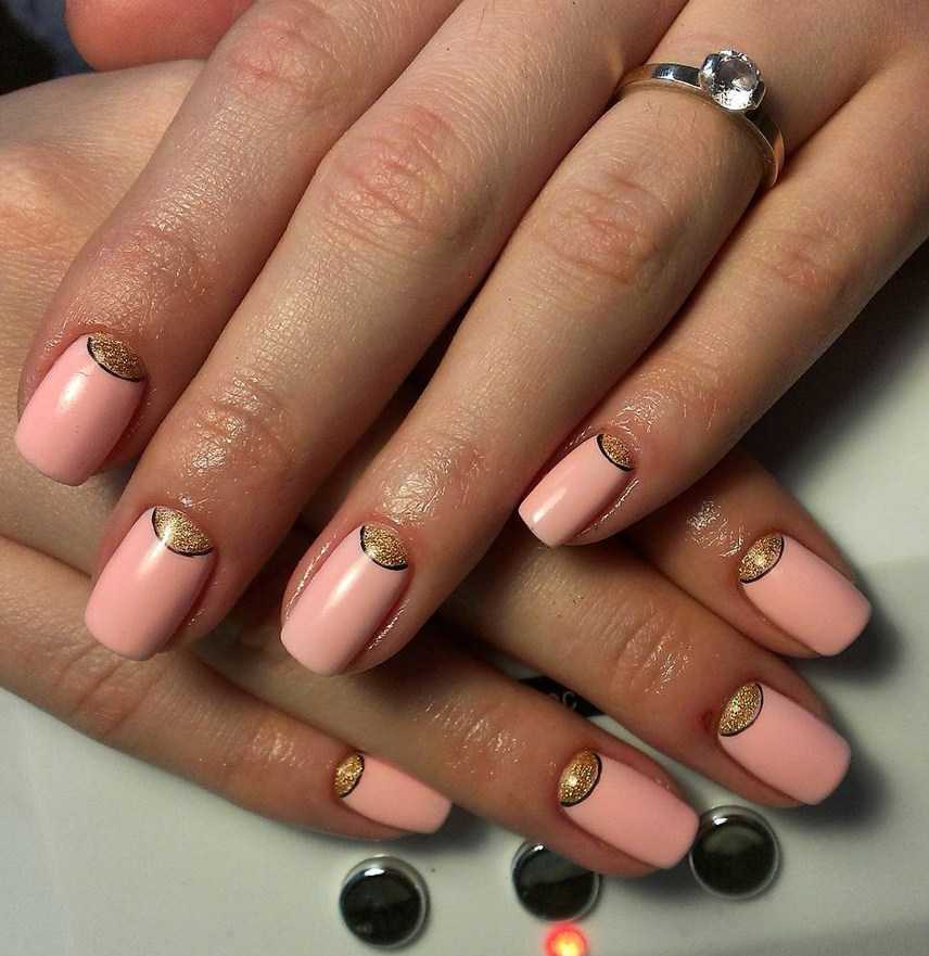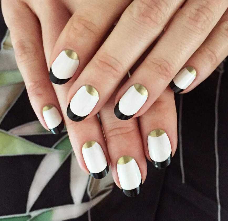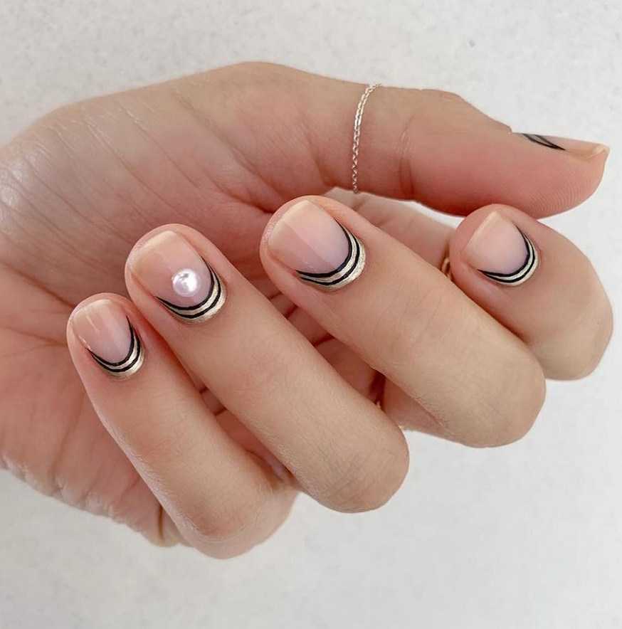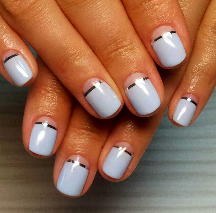 Когда-то свежо выглядело обрамление лунки тонкой полосой фольги. При этом сама лунка может быть того же цвета, контрастная или обнаженная. Сегодня это решение устарело, фольгированные линии смотрятся грубовато, но сама идея все еще в тренде. Линию можно прорисовать тонкой кистью, выложить стразами или камифубуки. Из чего можно сделать рамку сегодня: