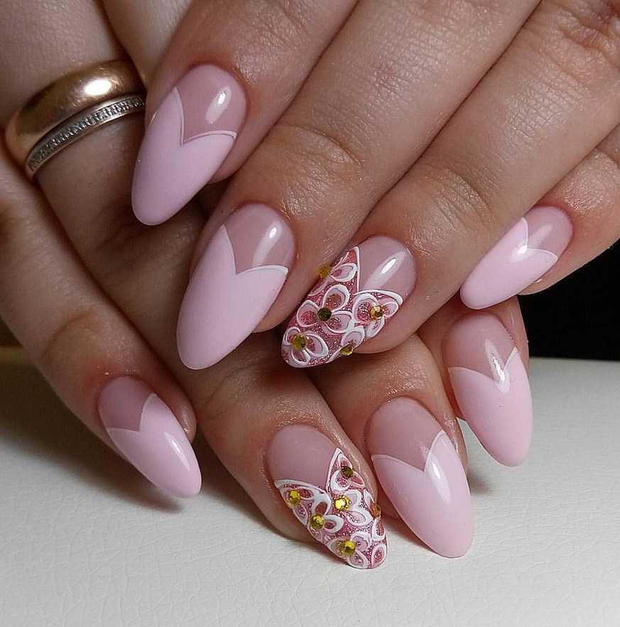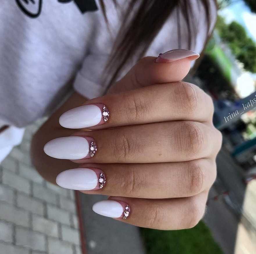 Самыми удачными вариациями лунного дизайна для миндальных ногтевых пластин считаются френч, оригинальные лунулы, оформление с мелкими блёстками и втиркой, с кристаллами и хрустальной пудрой.