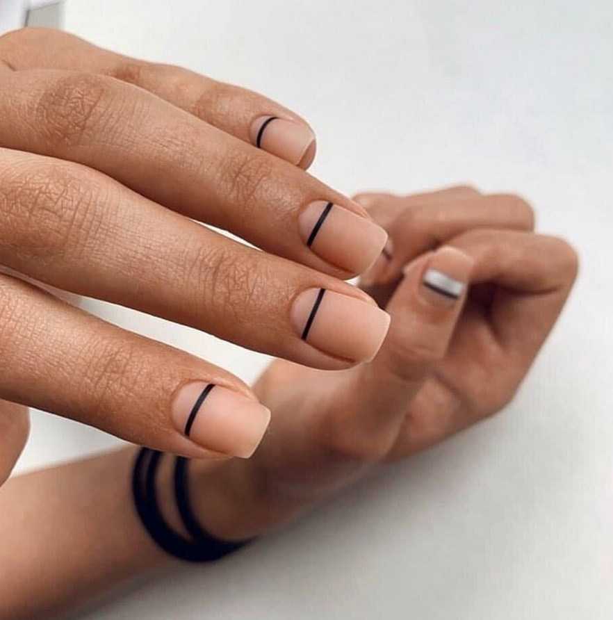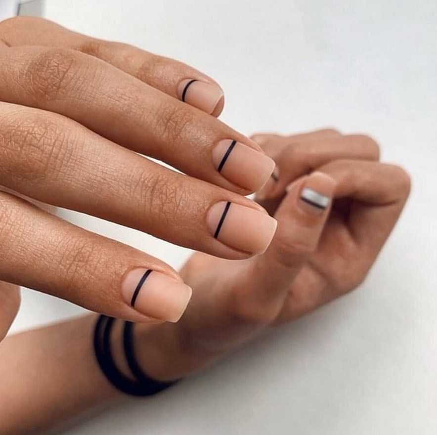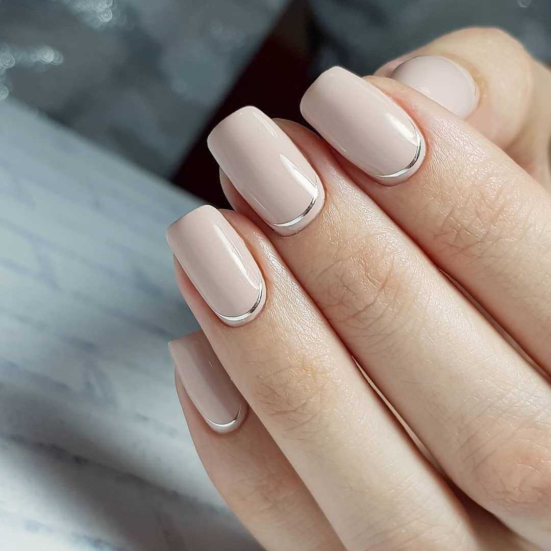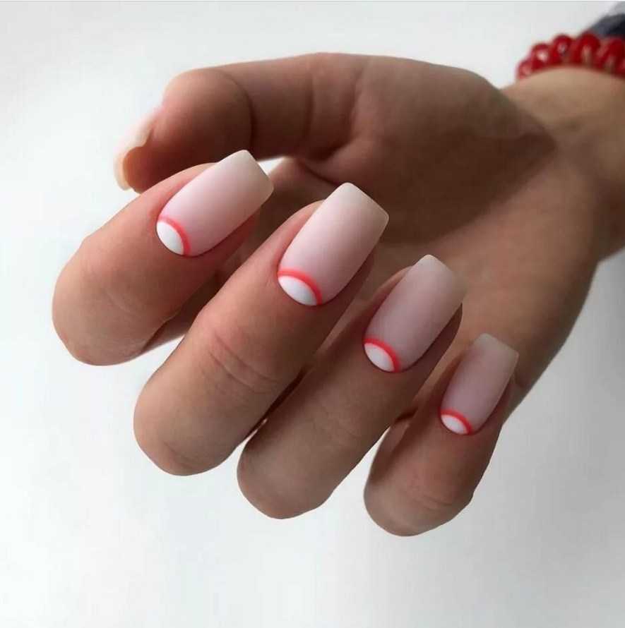 Стиль минимализм – актуальный выбор многих женщин, занимающихся офисным трудом, бизнес-леди. В этом варианте маникюр с лунками делают тонкими линиями и выполняют в скромных оттенках – разных вариациях бежевого, молочного, карамельного. Но даже минимализм может себе позволить чуть более яркий декор – неоновые рисунки, мелкие стразы, прорисовку лунок двойными линиями.