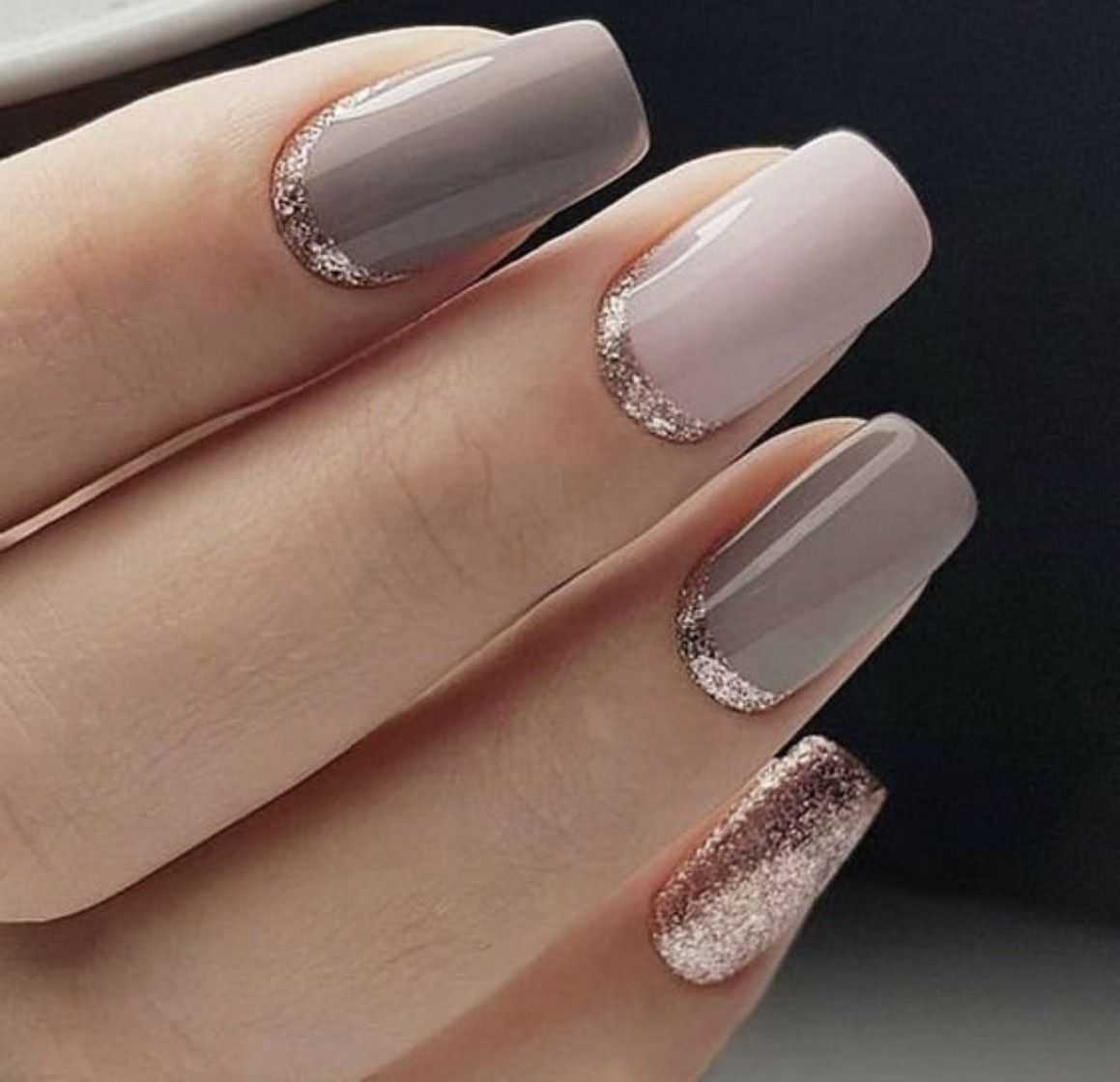 - Цепочки. Покрыть ногти матовым серым лаком, выложить полосы фольгой в цвете розового золота, сделать на полосах обрамление цепочками в тон.