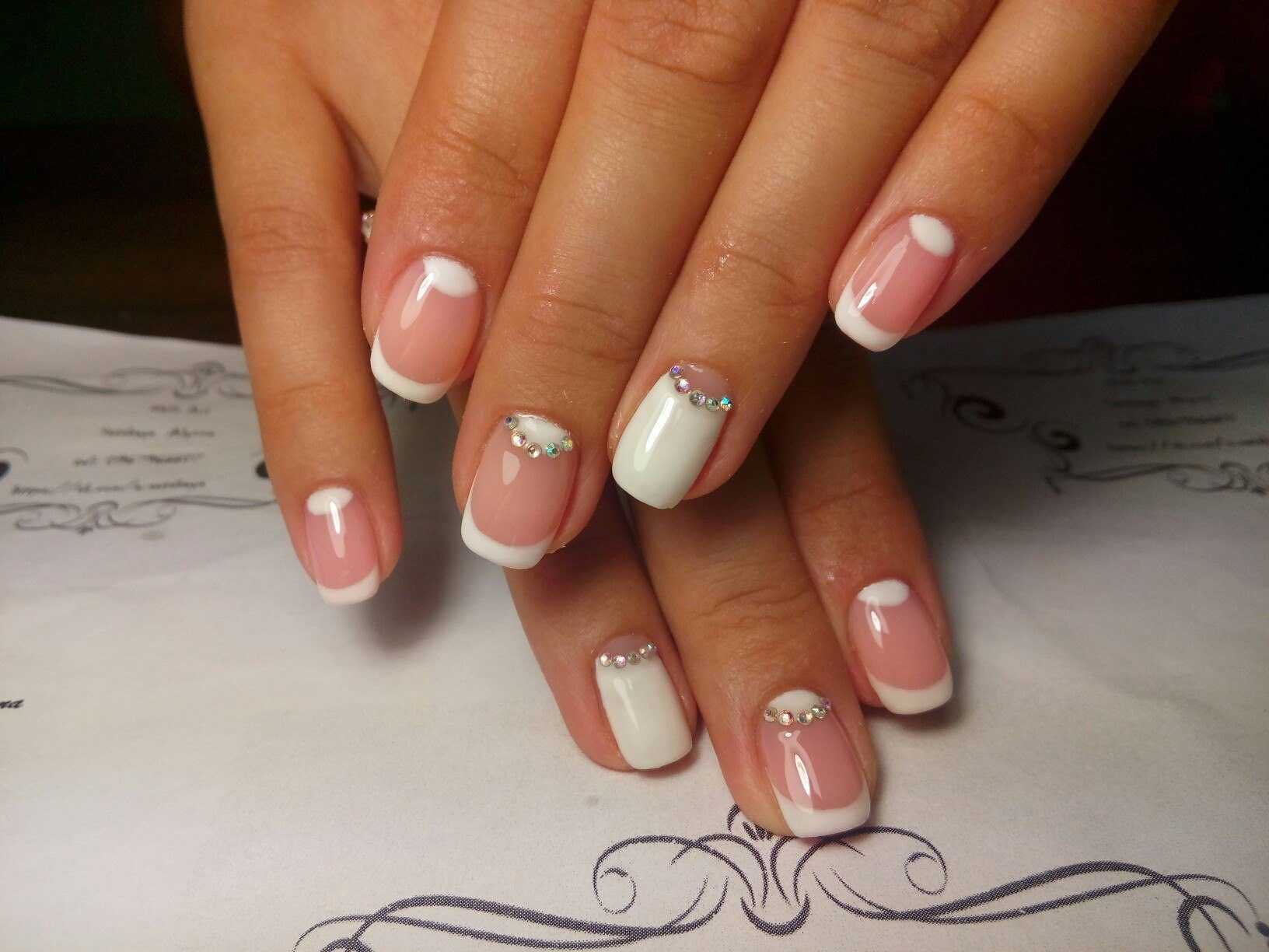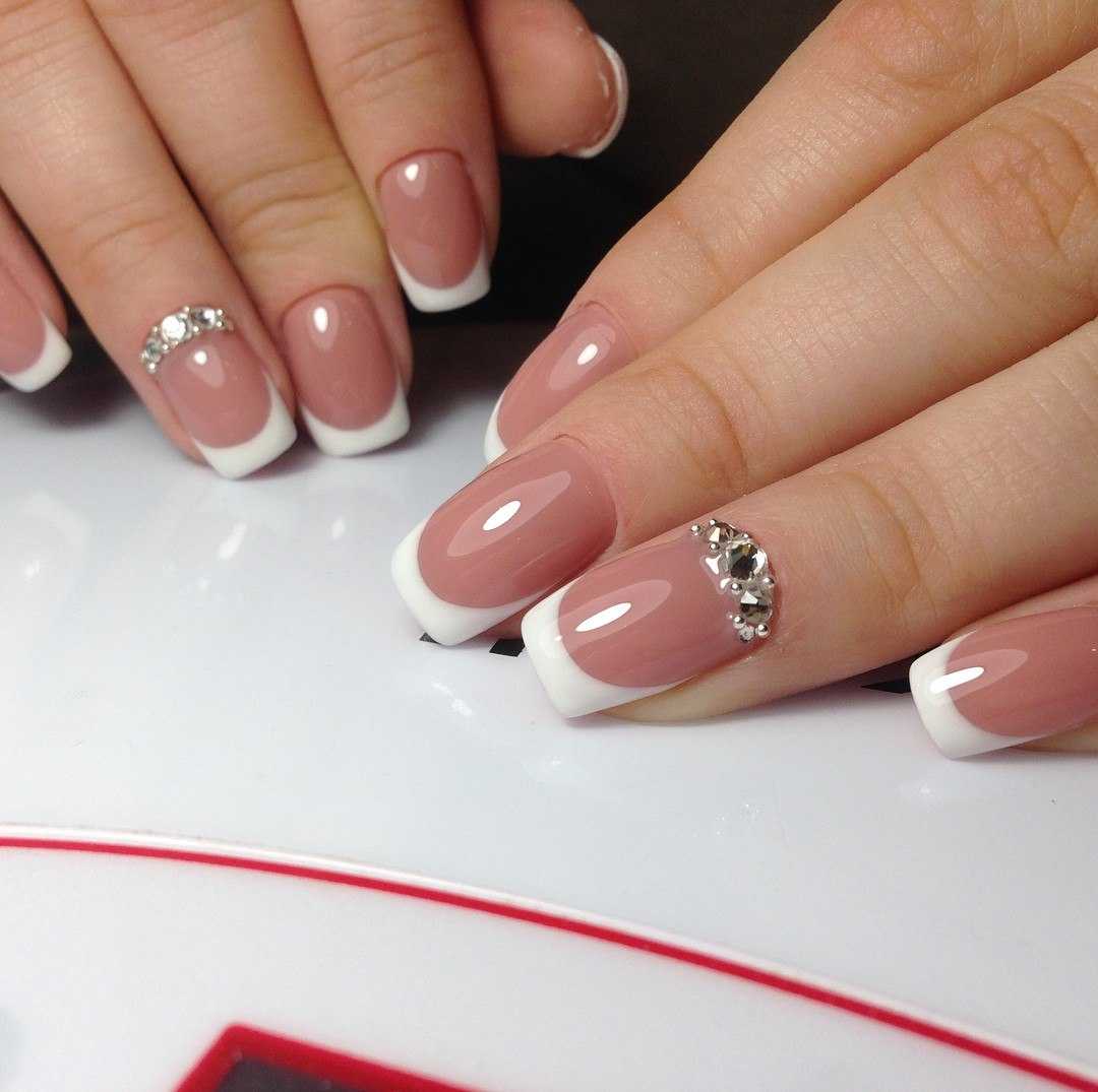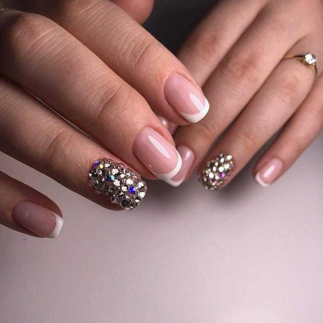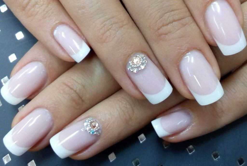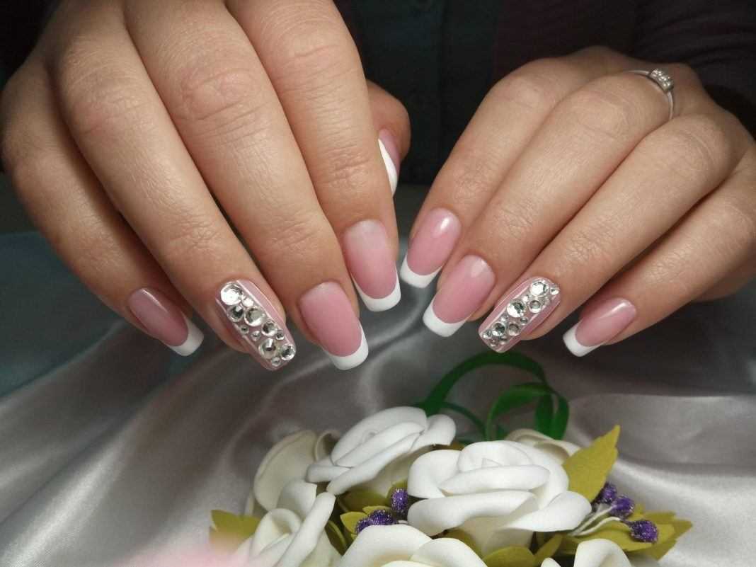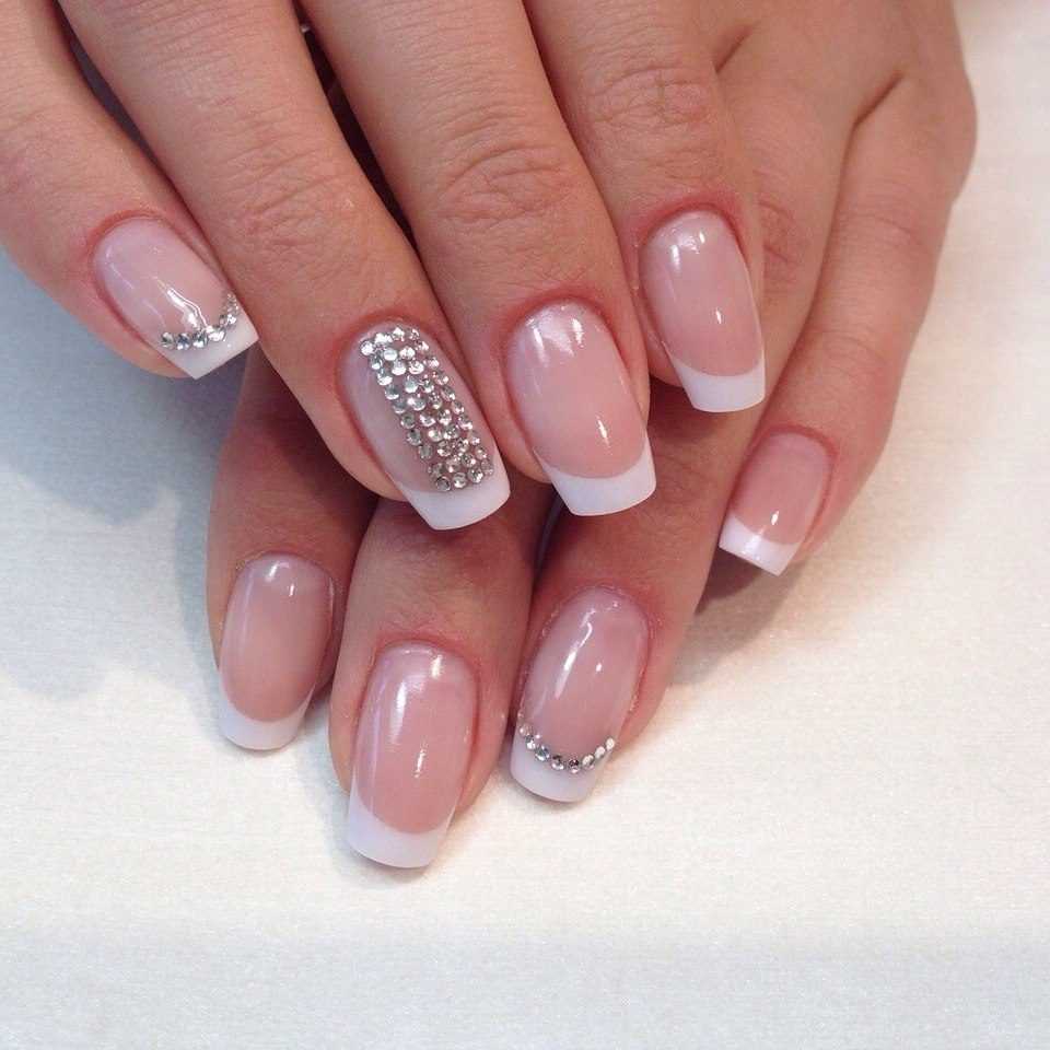 Одними из самых распространённых украшений для маникюра являются стразы. С их помощью можно придать удлинённый вид французскому маникюру. Для этого всего на всего необходимо выложить стразы в прямую линию. Также украсить квадратные ноготки можно выложив уголок из мерцающих камушков. Делая маникюр со стразами, необходимо как можно лучше их закрепить, чтобы они не отвалились в ответственный момент. Нежный и мягкий французский маникюр отлично гармонирует со стразами с разнообразной конфигурацией. Современная индустрия дает возможность мастерам маникюра поработать с разнообразными видами декоративных мерцающих камней. Это могут быть стеклянные или пластиковые стразы, хрустальные крошки и жемчужные камешки. Современные стилисты дают совет обладательницам длинных ноготков украшать свой маникюр при помощи крупных страз. Это придаст ноготкам богатый и изысканный вид.