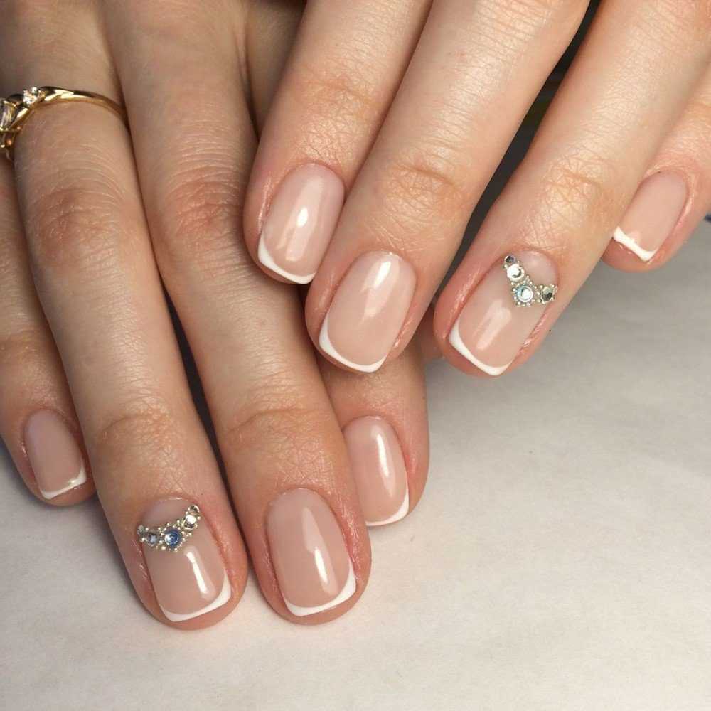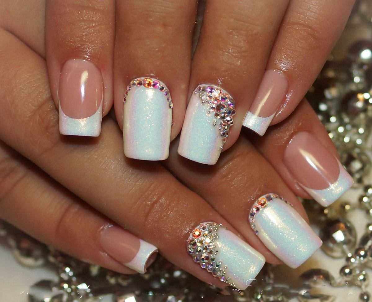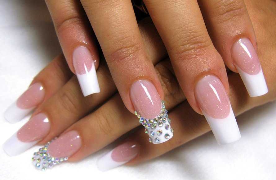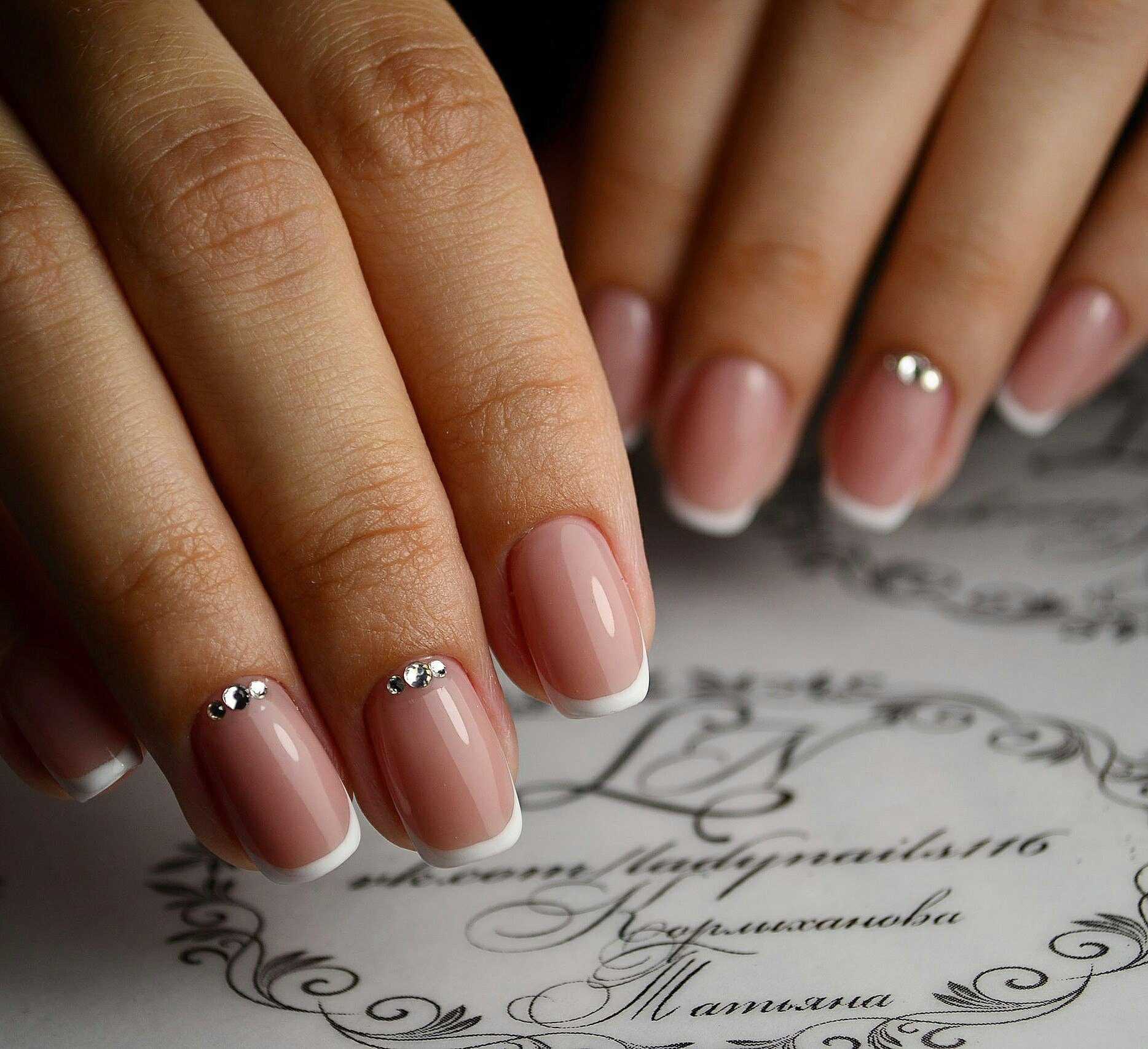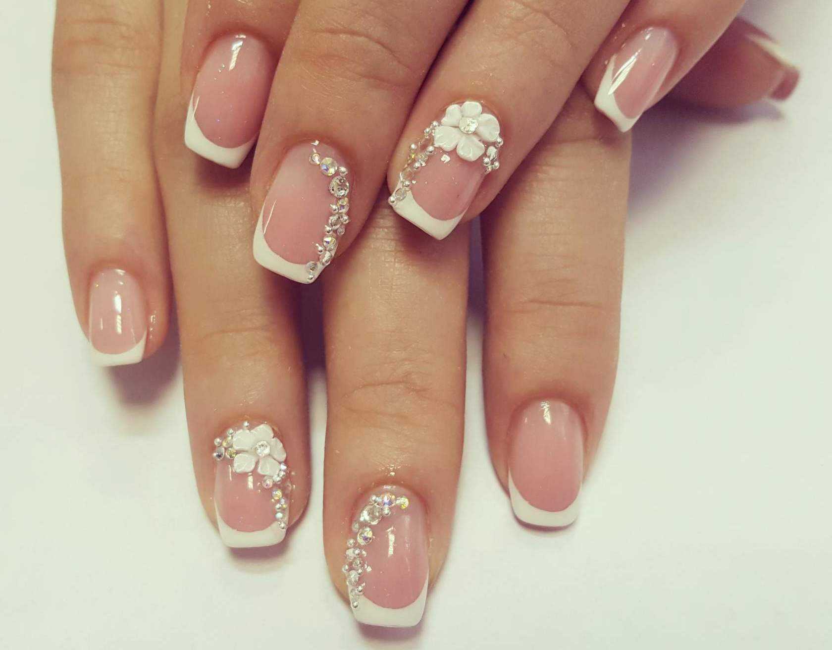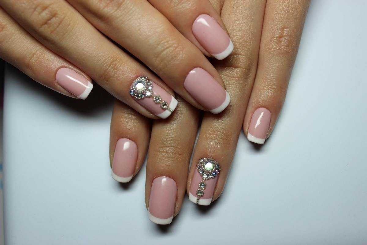Одними из самых распространённых украшений для маникюра являются стразы. С их помощью можно придать удлинённый вид французскому маникюру. Для этого всего на всего необходимо выложить стразы в прямую линию. Также украсить квадратные ноготки можно выложив уголок из мерцающих камушков. Делая маникюр со стразами, необходимо как можно лучше их закрепить, чтобы они не отвалились в ответственный момент. Нежный и мягкий французский маникюр отлично гармонирует со стразами с разнообразной конфигурацией. Современная индустрия дает возможность мастерам маникюра поработать с разнообразными видами декоративных мерцающих камней. Это могут быть стеклянные или пластиковые стразы, хрустальные крошки и жемчужные камешки. Современные стилисты дают совет обладательницам длинных ноготков украшать свой маникюр при помощи крупных страз. Это придаст ноготкам богатый и изысканный вид.