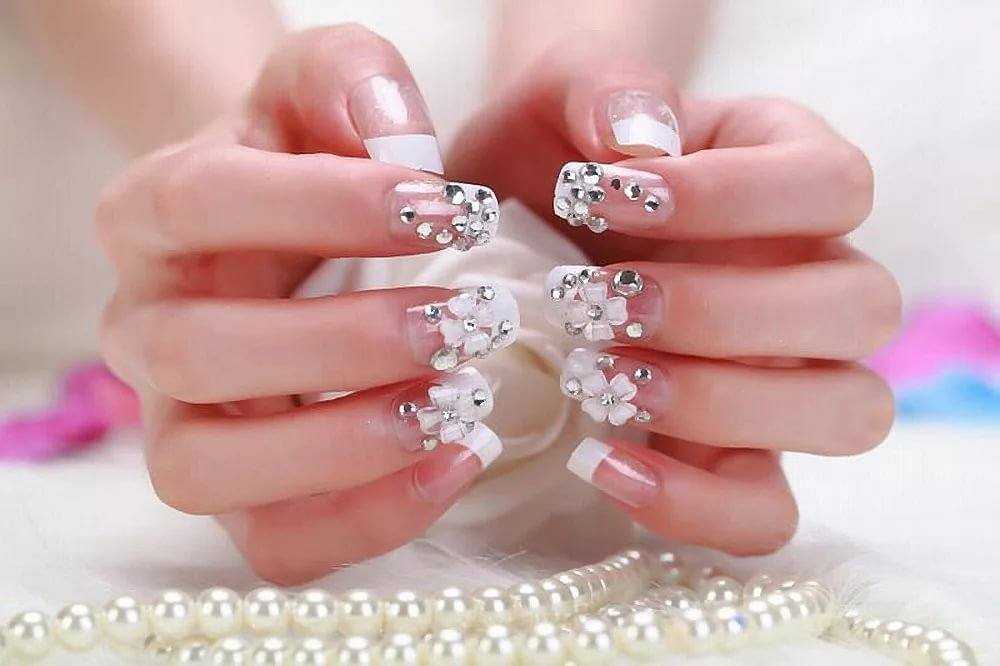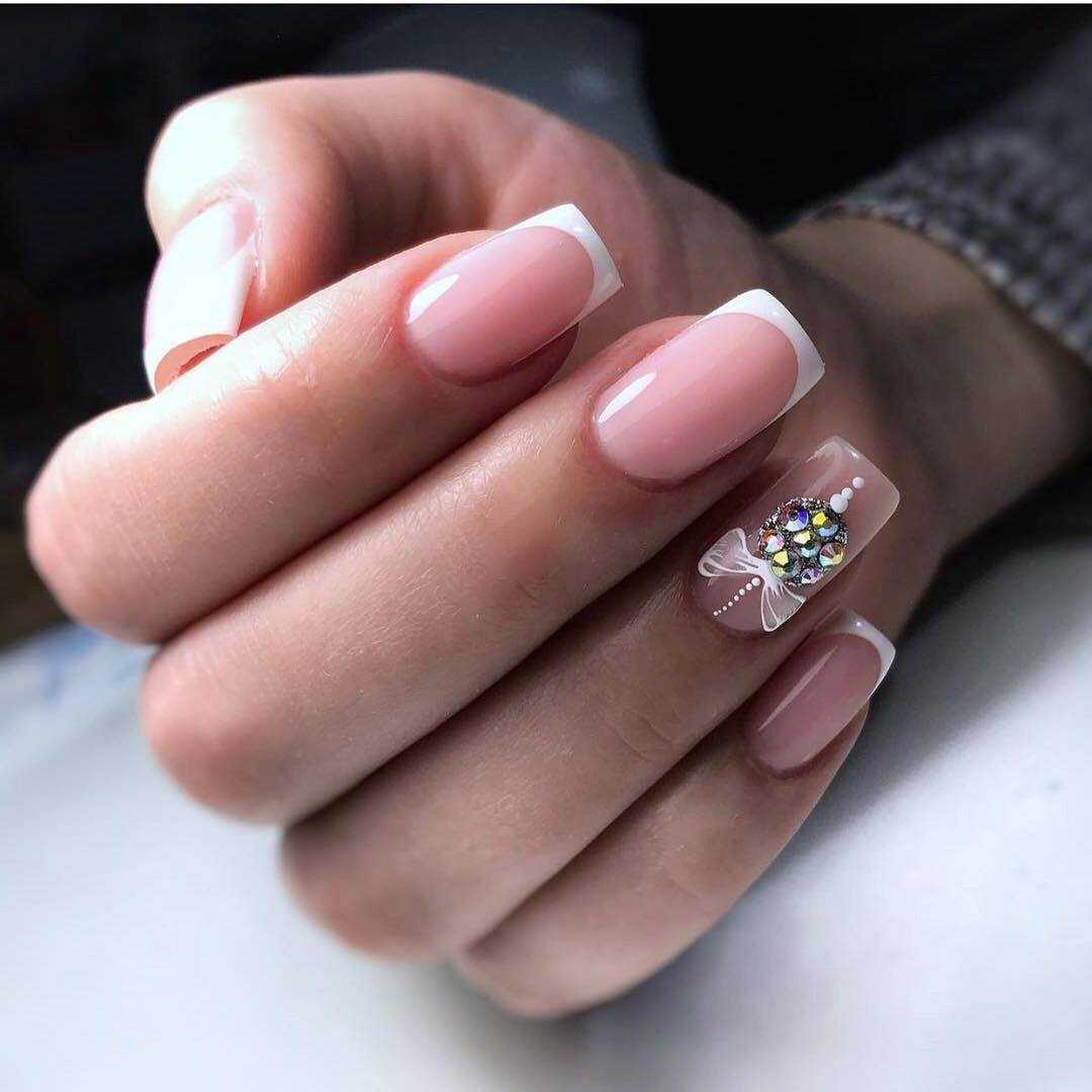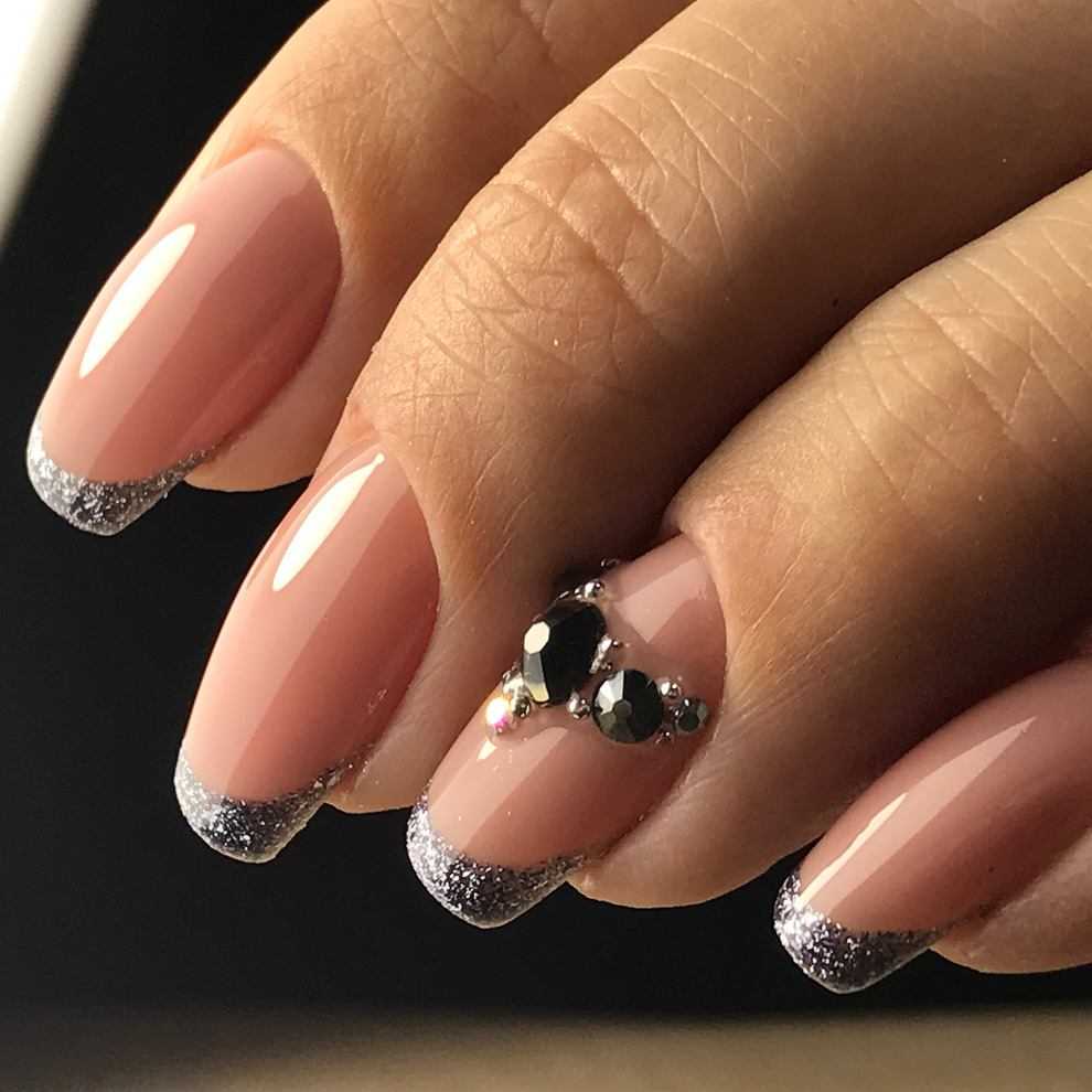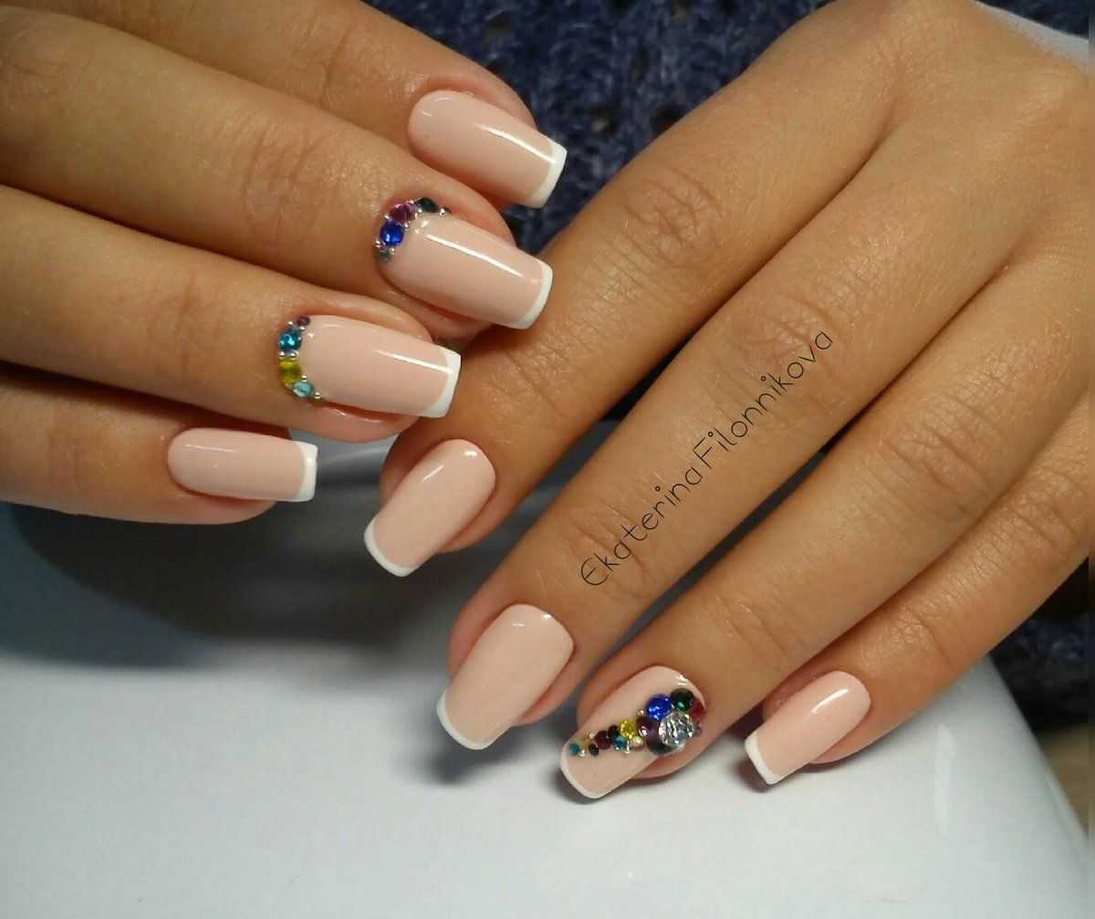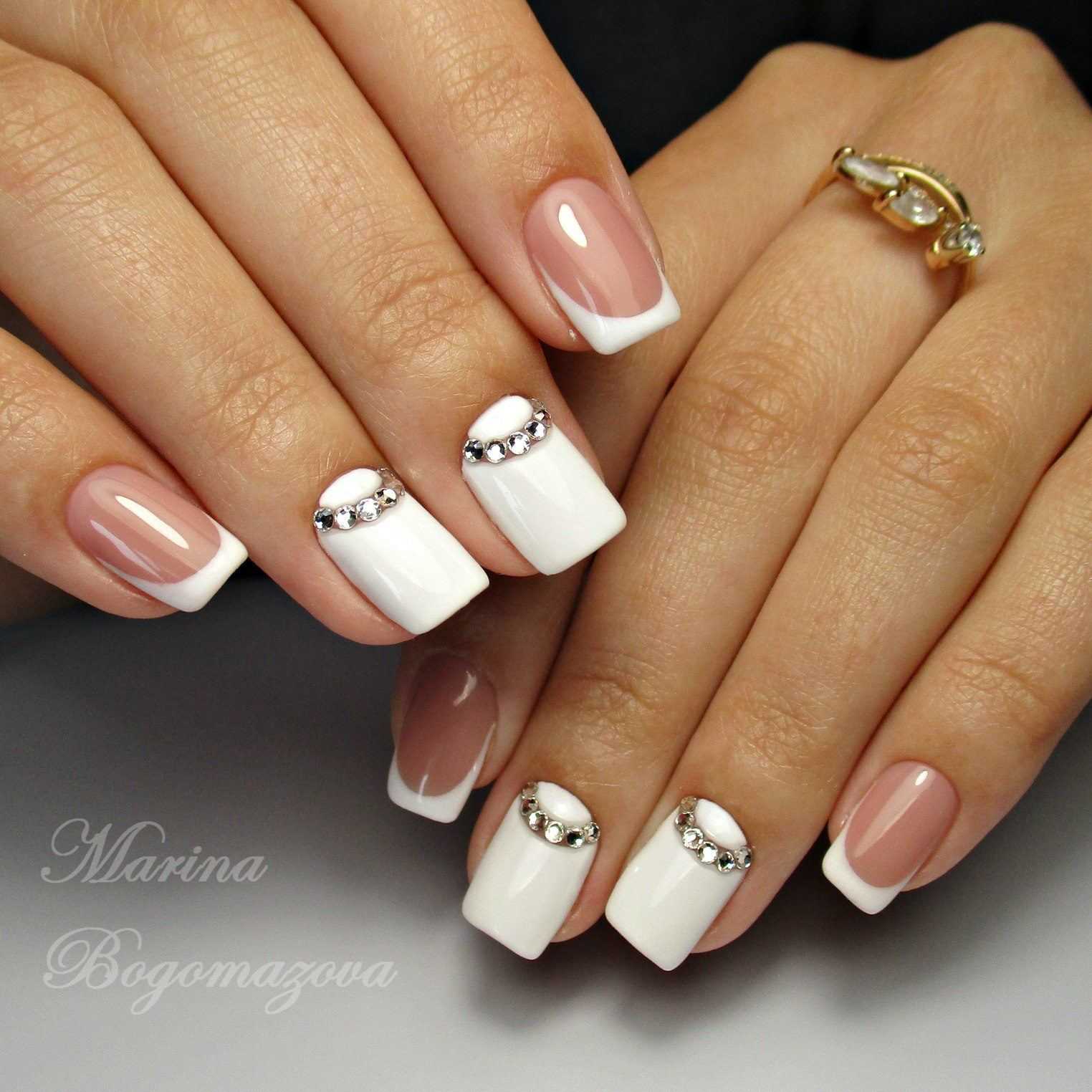 Одними из самых распространённых украшений для маникюра являются стразы. С их помощью можно придать удлинённый вид французскому маникюру. Для этого всего на всего необходимо выложить стразы в прямую линию. Также украсить квадратные ноготки можно выложив уголок из мерцающих камушков. Делая маникюр со стразами, необходимо как можно лучше их закрепить, чтобы они не отвалились в ответственный момент. Нежный и мягкий французский маникюр отлично гармонирует со стразами с разнообразной конфигурацией. Современная индустрия дает возможность мастерам маникюра поработать с разнообразными видами декоративных мерцающих камней. Это могут быть стеклянные или пластиковые стразы, хрустальные крошки и жемчужные камешки. Современные стилисты дают совет обладательницам длинных ноготков украшать свой маникюр при помощи крупных страз. Это придаст ноготкам богатый и изысканный вид.