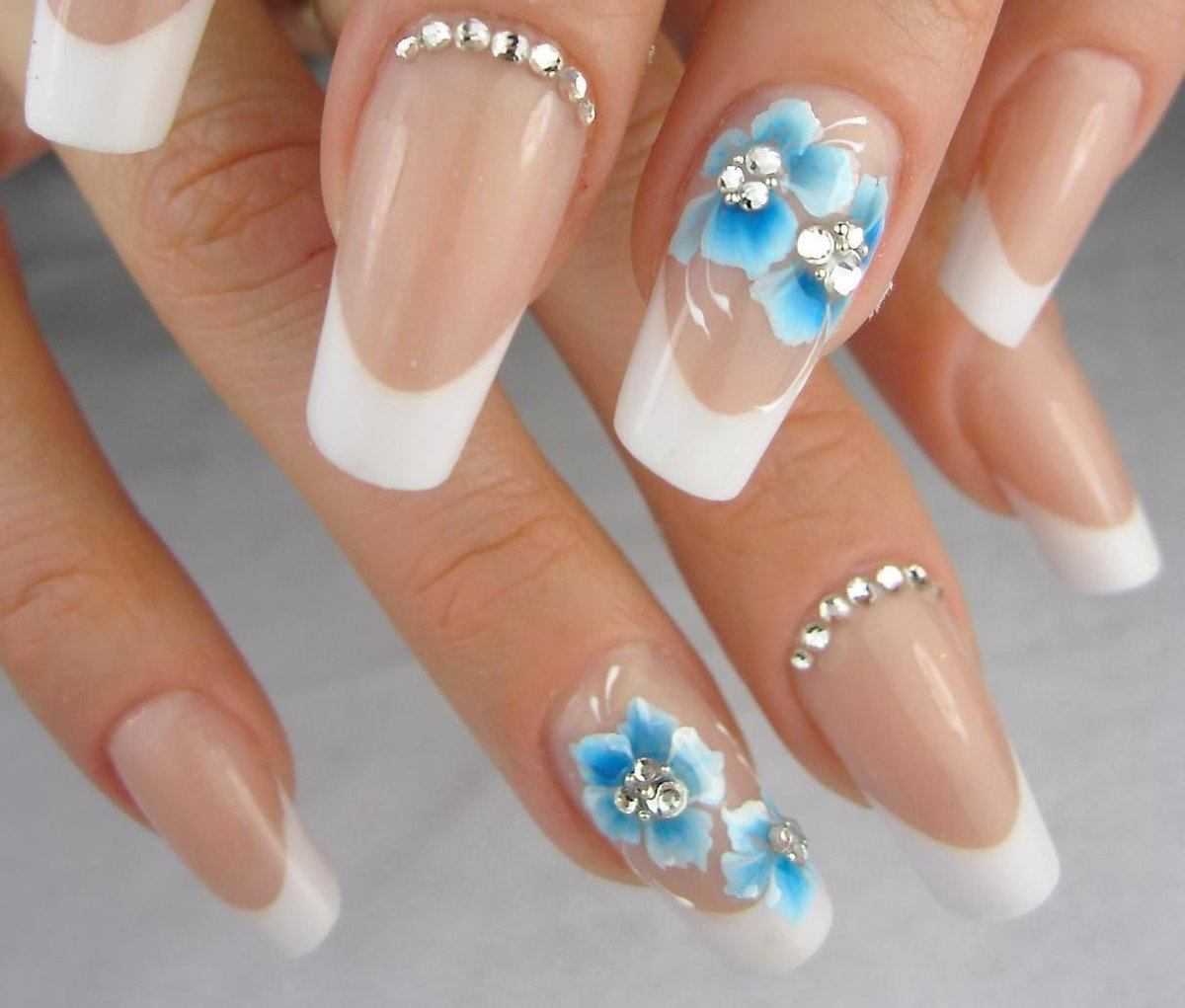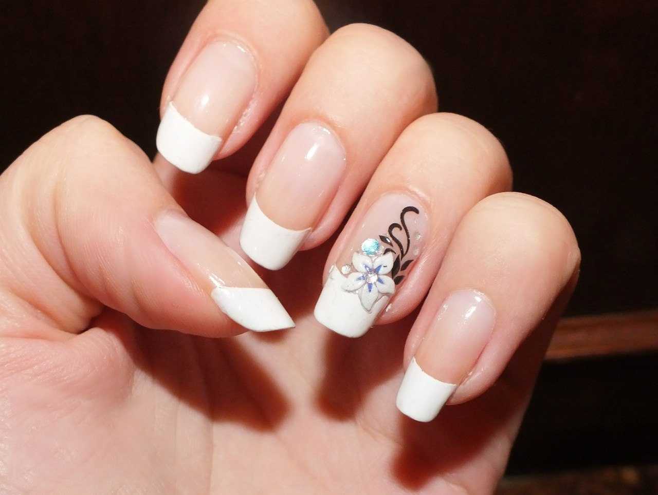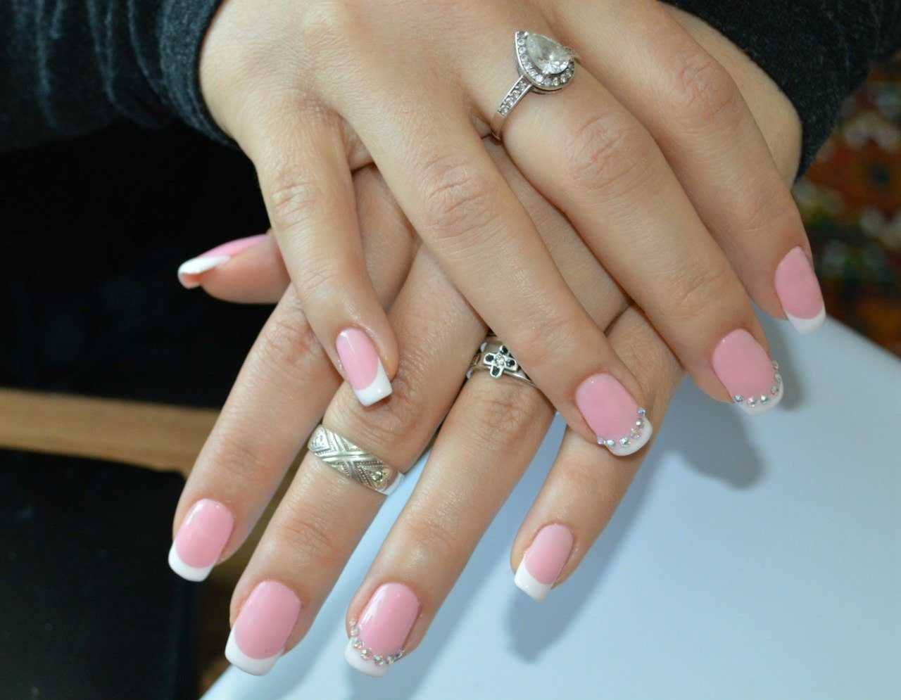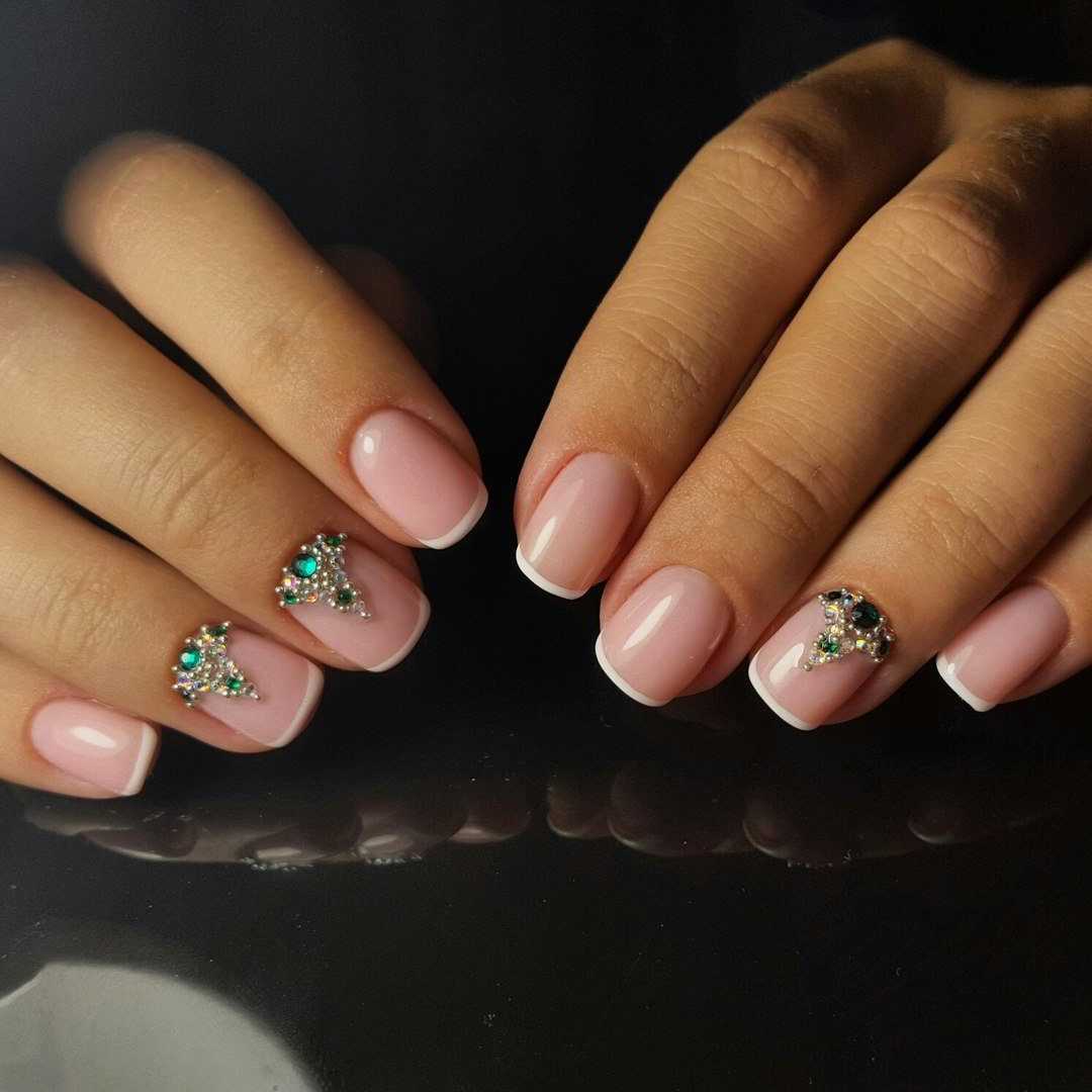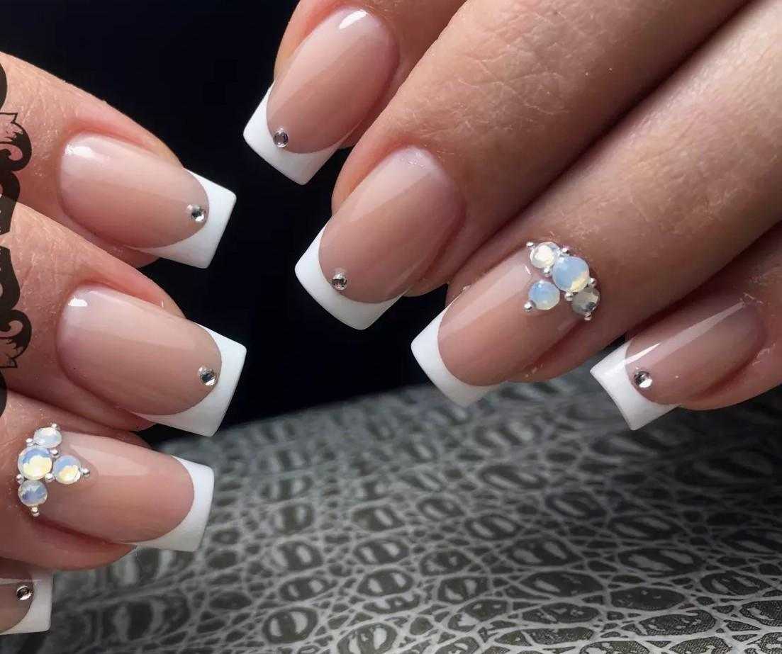 Одними из самых распространённых украшений для маникюра являются стразы. С их помощью можно придать удлинённый вид французскому маникюру. Для этого всего на всего необходимо выложить стразы в прямую линию. Также украсить квадратные ноготки можно выложив уголок из мерцающих камушков. Делая маникюр со стразами, необходимо как можно лучше их закрепить, чтобы они не отвалились в ответственный момент. Нежный и мягкий французский маникюр отлично гармонирует со стразами с разнообразной конфигурацией. Современная индустрия дает возможность мастерам маникюра поработать с разнообразными видами декоративных мерцающих камней. Это могут быть стеклянные или пластиковые стразы, хрустальные крошки и жемчужные камешки. Современные стилисты дают совет обладательницам длинных ноготков украшать свой маникюр при помощи крупных страз. Это придаст ноготкам богатый и изысканный вид.