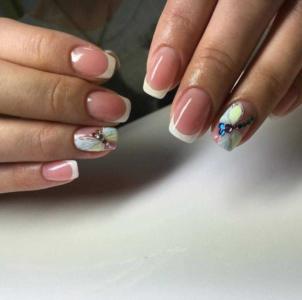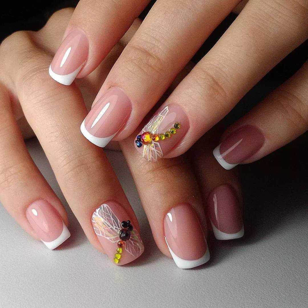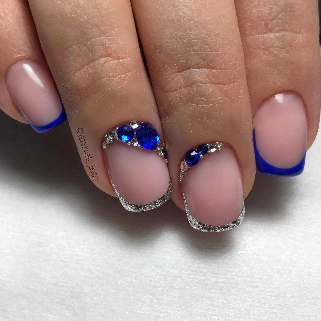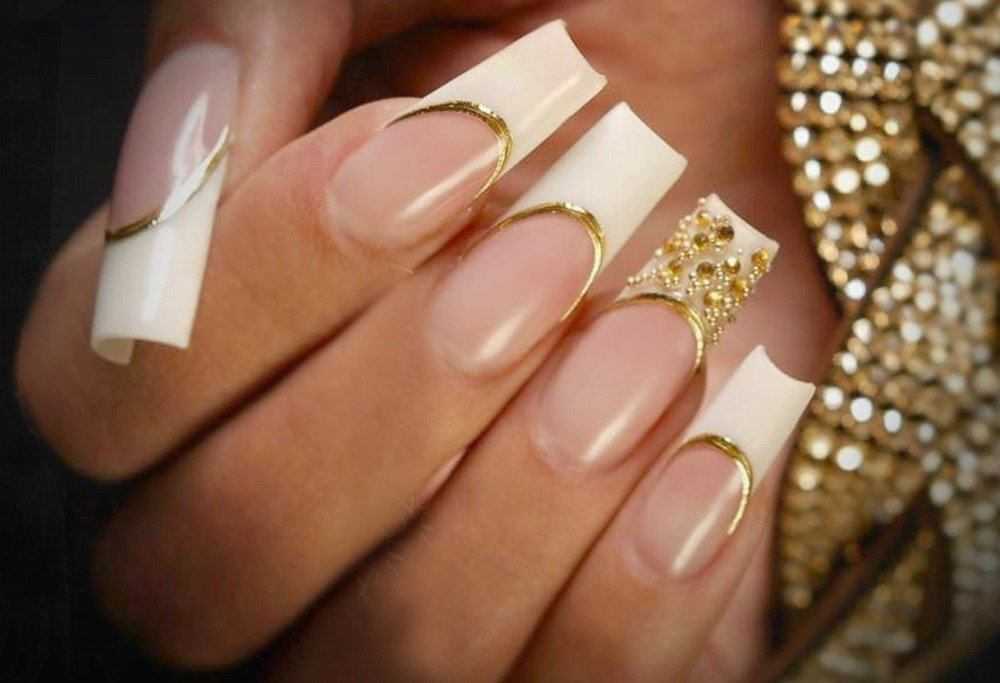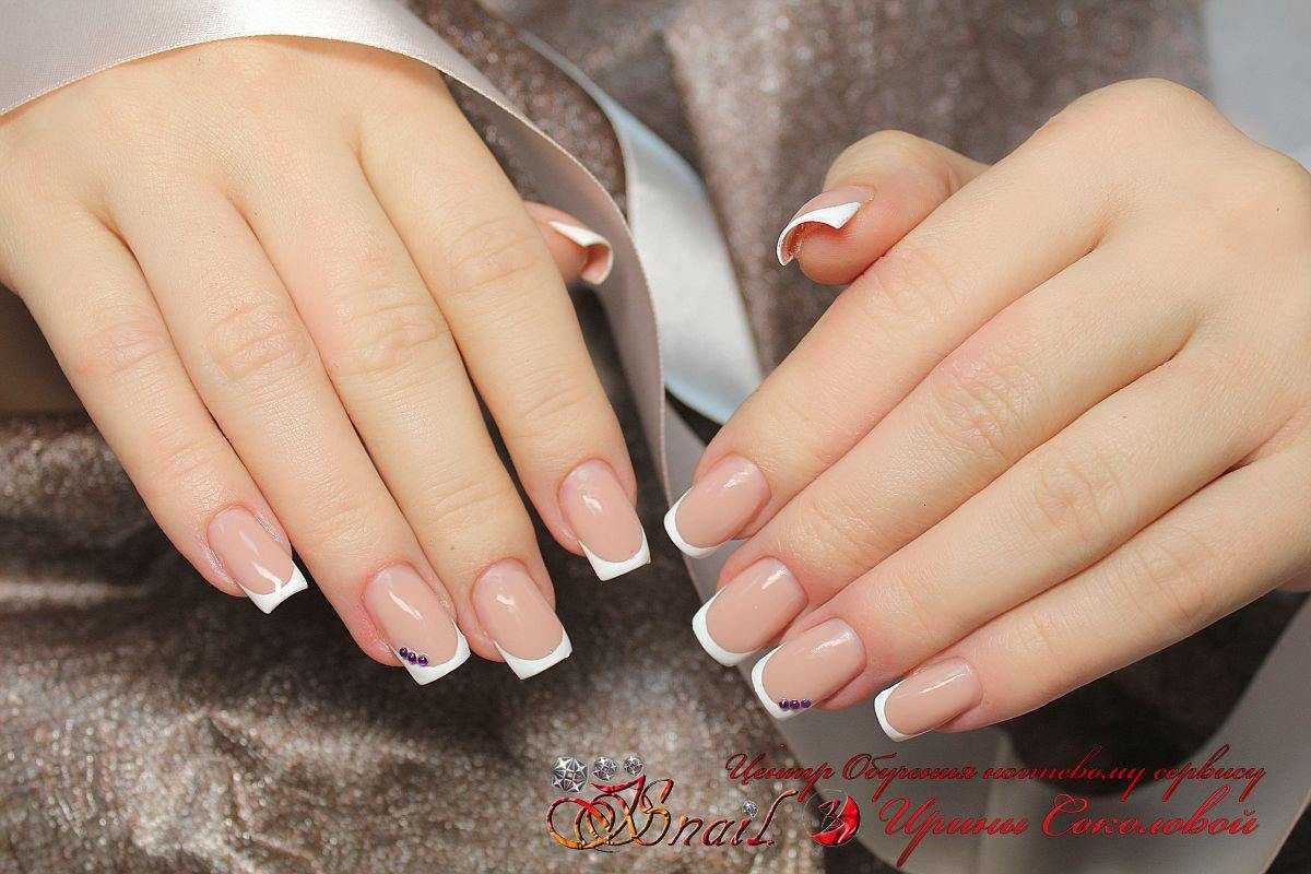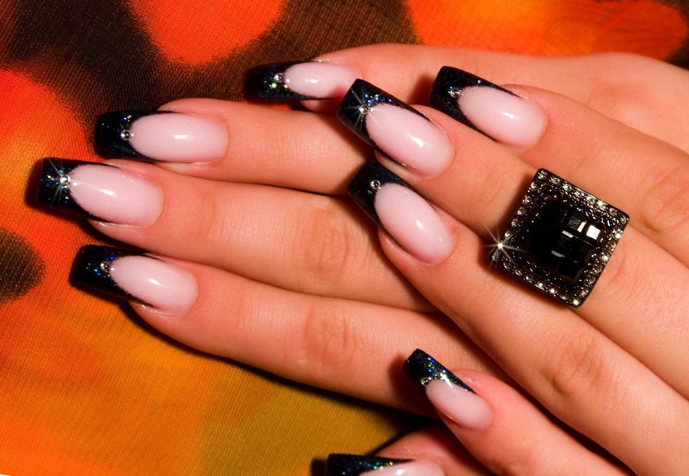 Одними из самых распространённых украшений для маникюра являются стразы. С их помощью можно придать удлинённый вид французскому маникюру. Для этого всего на всего необходимо выложить стразы в прямую линию. Также украсить квадратные ноготки можно выложив уголок из мерцающих камушков. Делая маникюр со стразами, необходимо как можно лучше их закрепить, чтобы они не отвалились в ответственный момент. Нежный и мягкий французский маникюр отлично гармонирует со стразами с разнообразной конфигурацией. Современная индустрия дает возможность мастерам маникюра поработать с разнообразными видами декоративных мерцающих камней. Это могут быть стеклянные или пластиковые стразы, хрустальные крошки и жемчужные камешки. Современные стилисты дают совет обладательницам длинных ноготков украшать свой маникюр при помощи крупных страз. Это придаст ноготкам богатый и изысканный вид.