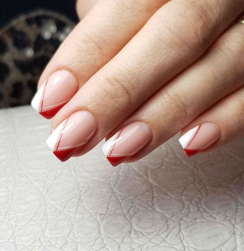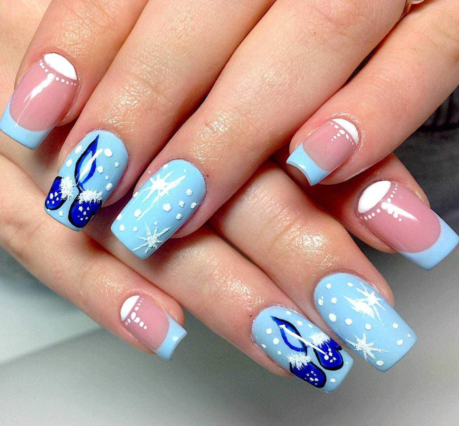 Кажется, что новогодний маникюр никогда не бывает «чересчур», поэтому тут можно за раз воплотить все свои желания в жизнь. В новогоднем двойном френче часто используют белый, красный, голубой и зеленый. Помимо этого, добавляются узоры в виде точек и снежинок. Отличный вариант создать себе новогоднее настроение!
