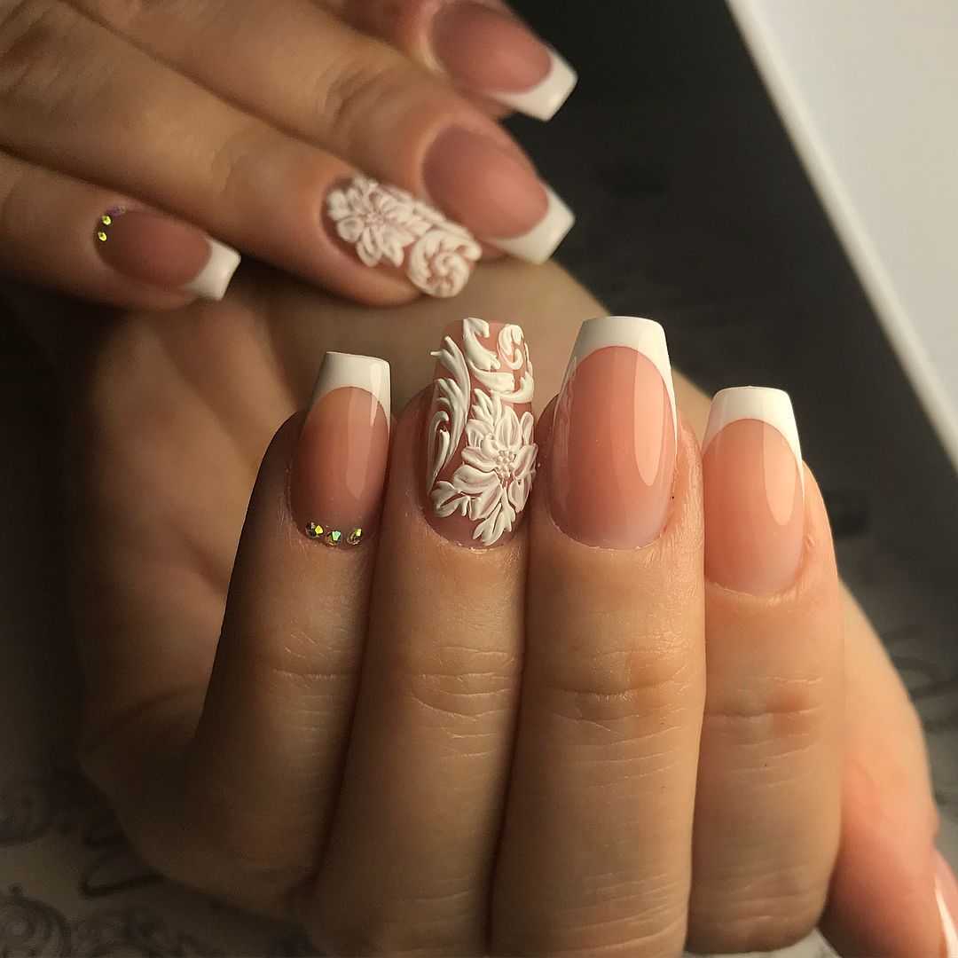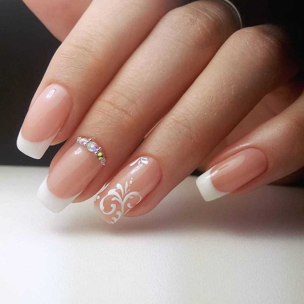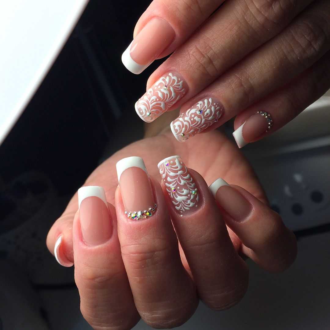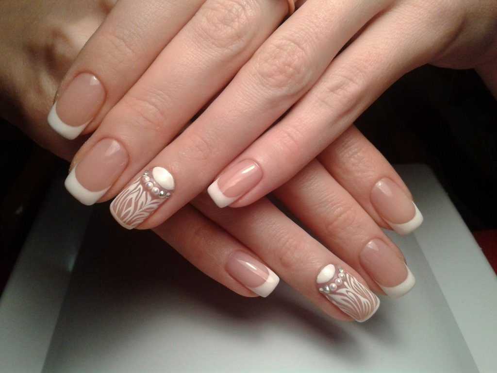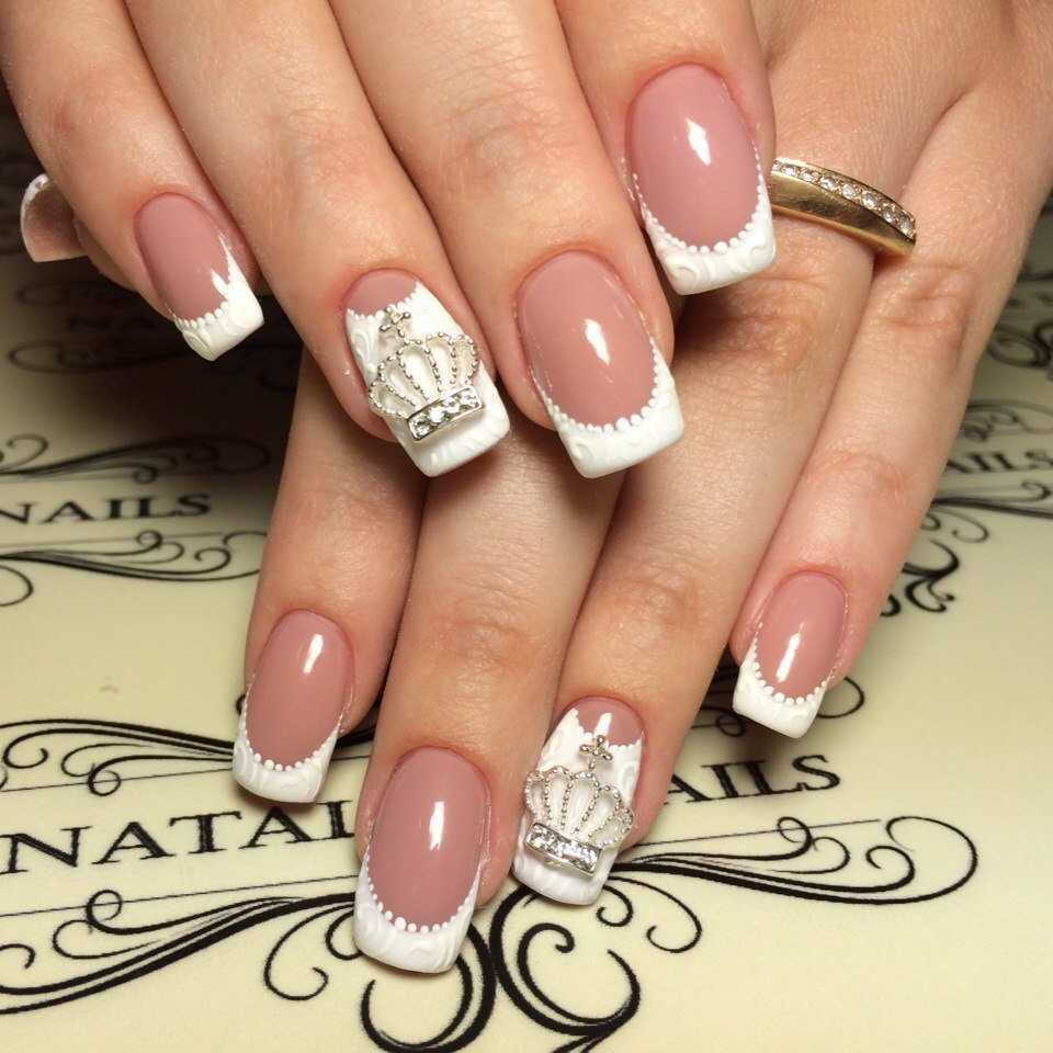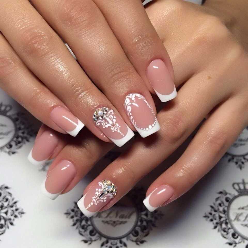 Двойной френч на свадьбу выполнить сложно, но маникюр точно того стоит, потому что выглядит он максимально нежно и женственно. Обычно ногти выполняются в нежно-розовых и белых тонах с добавлением камней. Расцветка отлично сочетается с платьем.