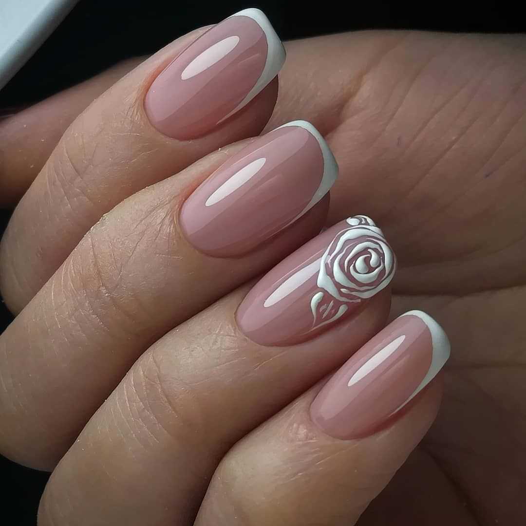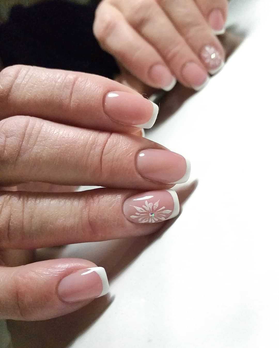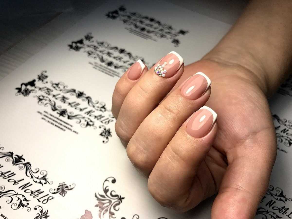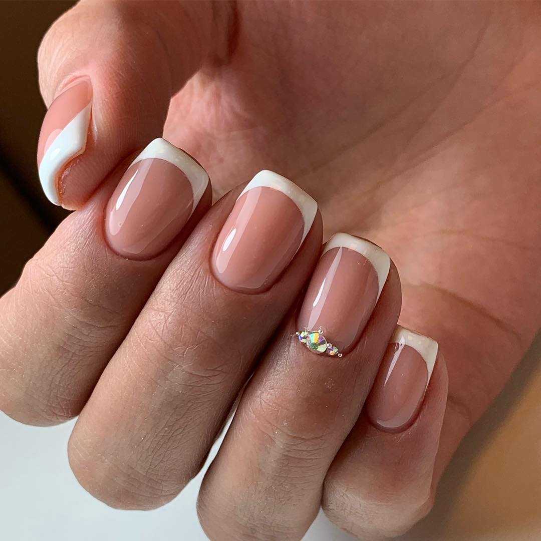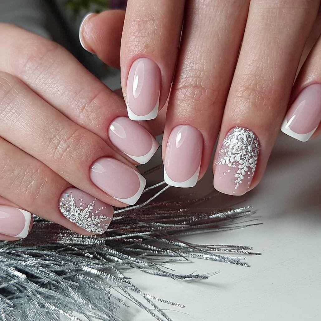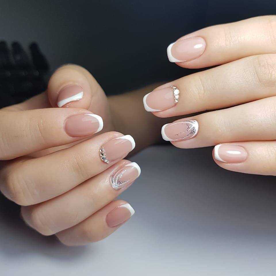 Двойной френч на свадьбу выполнить сложно, но маникюр точно того стоит, потому что выглядит он максимально нежно и женственно. Обычно ногти выполняются в нежно-розовых и белых тонах с добавлением камней. Расцветка отлично сочетается с платьем.