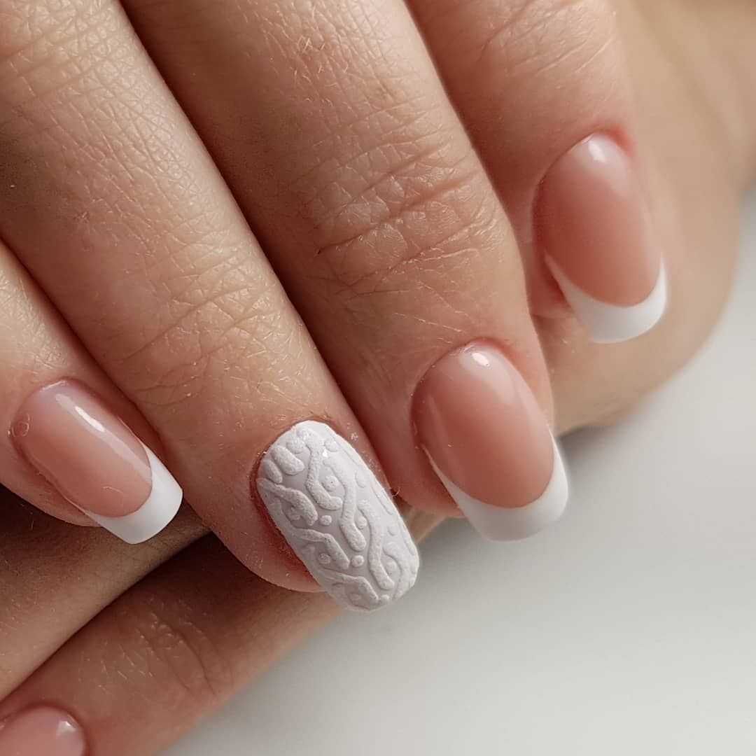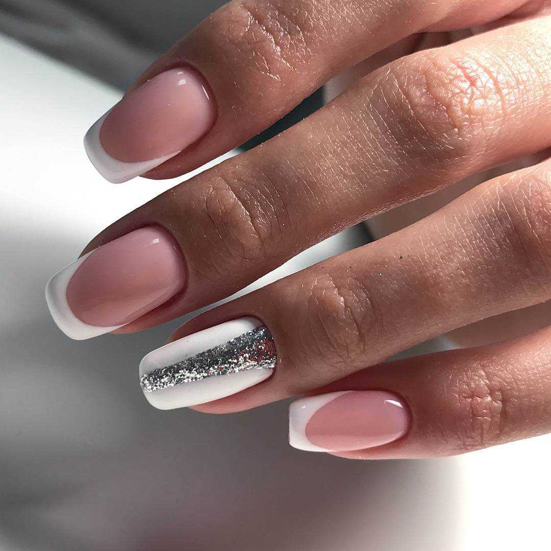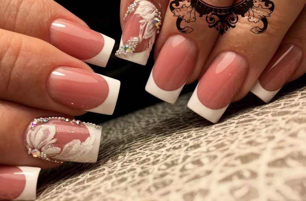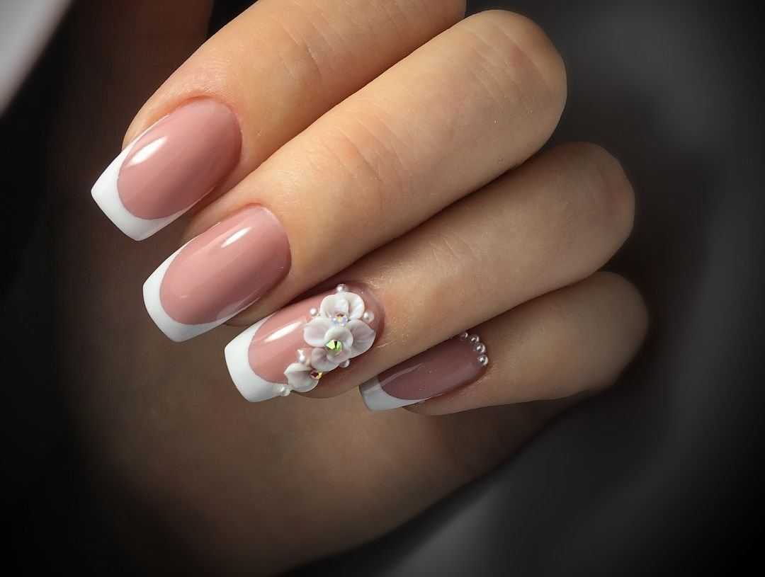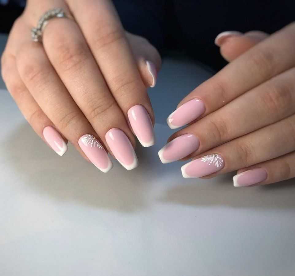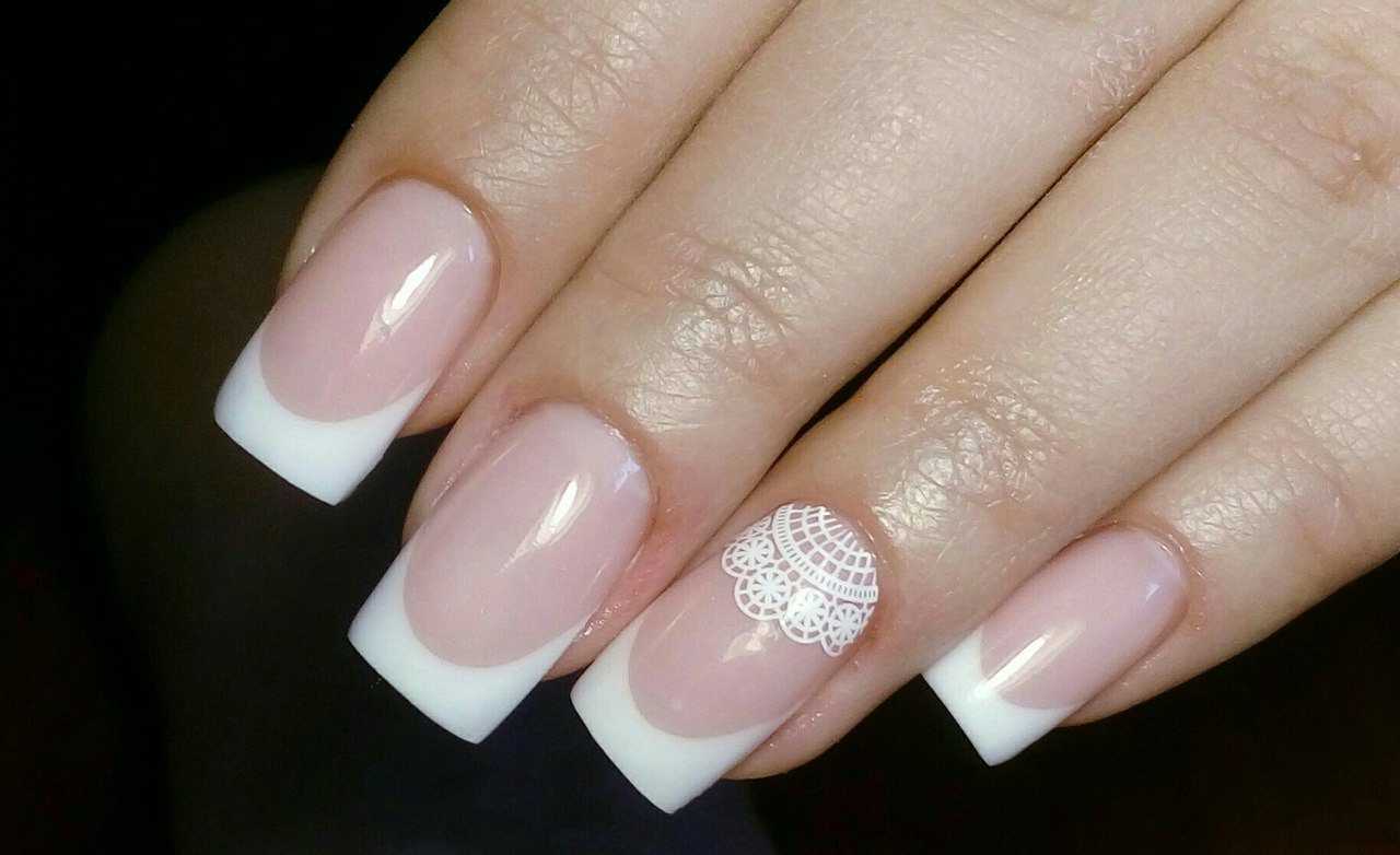 Двойной френч на свадьбу выполнить сложно, но маникюр точно того стоит, потому что выглядит он максимально нежно и женственно. Обычно ногти выполняются в нежно-розовых и белых тонах с добавлением камней. Расцветка отлично сочетается с платьем.