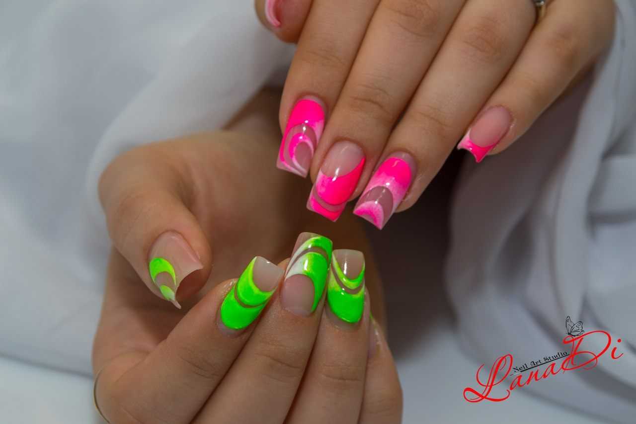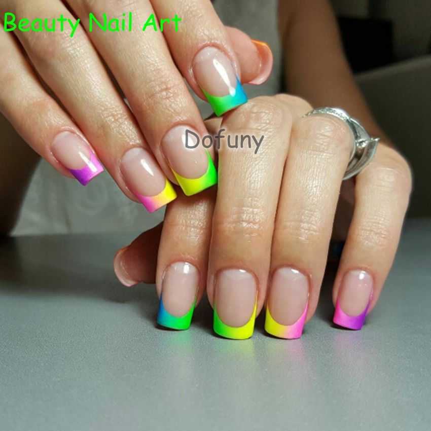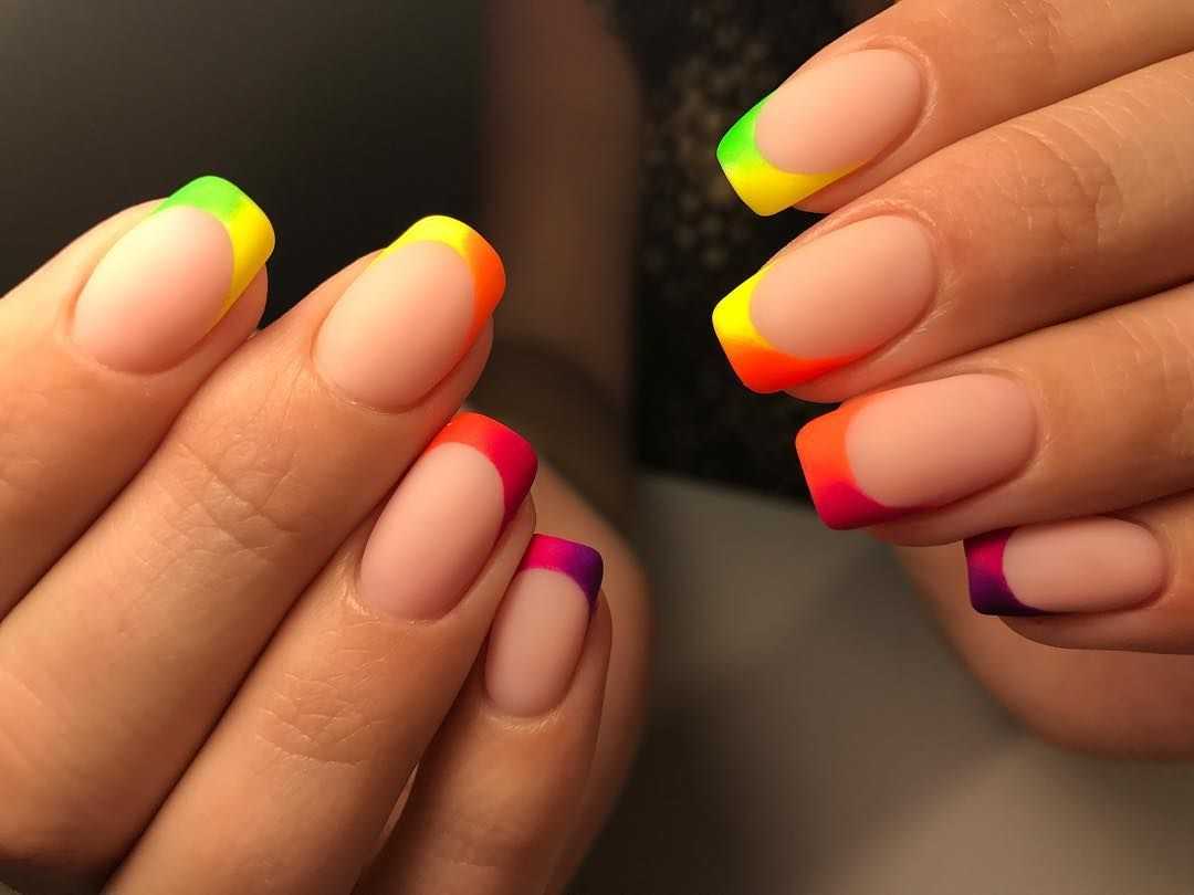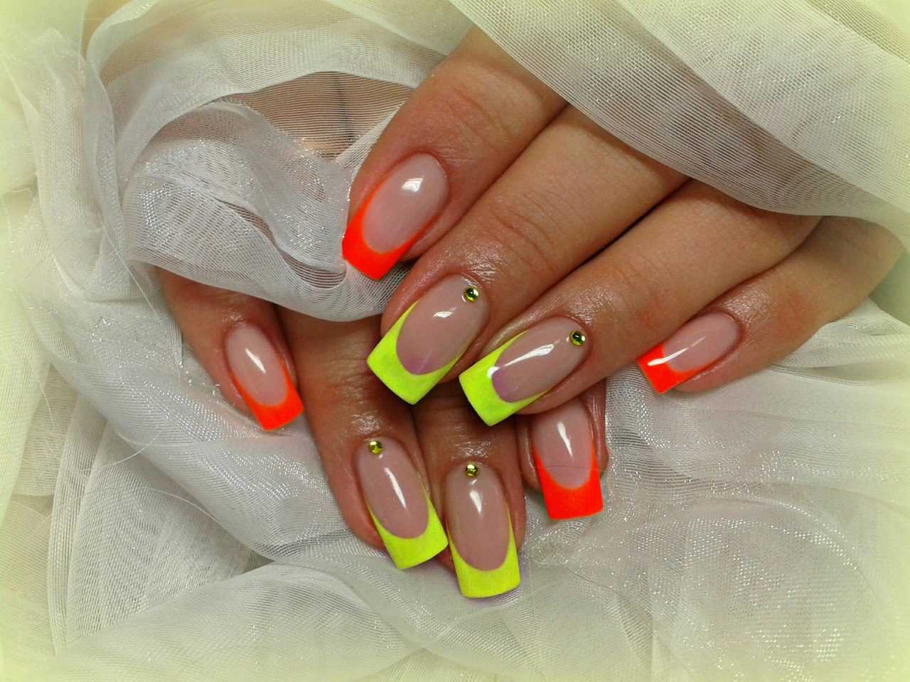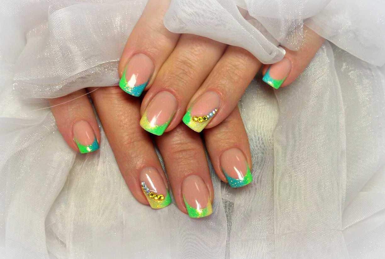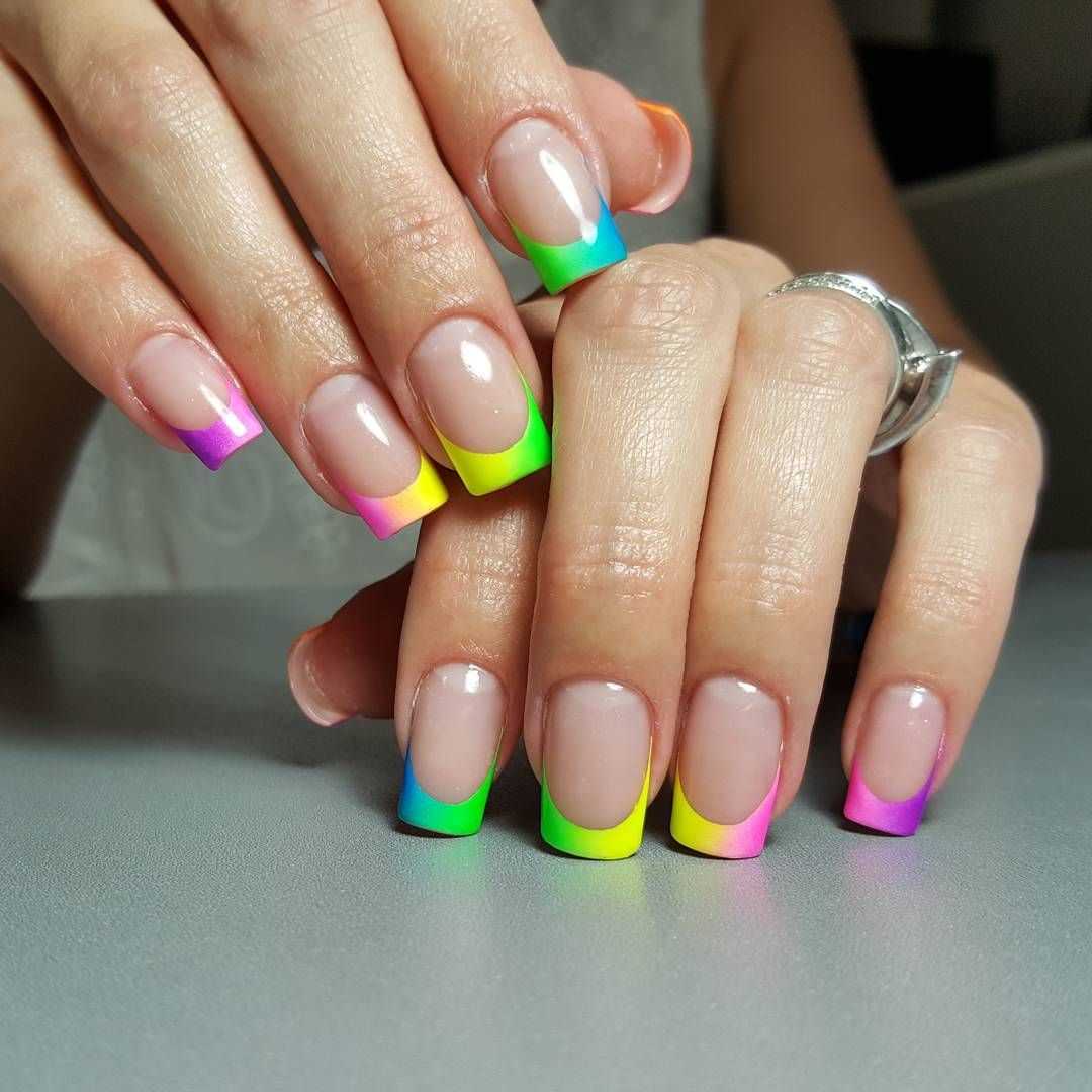 Многие современные красавицы считают, что на короткие ноготки очень сложно сделать французский маникюр. Это мнение совершенно ошибочно. Всего на всего необходимую белую линию френча выполняют как можно уже, чем обычно. Короткие квадратные ноготки можно украсить при помощи цветных улыбок. Это может быть черный, фиолетовый, красный или даже зеленый тон. Для летнего периода времени идеально подойдут неоновые лаковые покрытия. Для молоденьких красавиц стилисты предлагают разноцветный (твист) френч. Под твистом подразумевается пять разноцветных оттенков для выполнения единого дизайна. Также существует декорированный французский маникюр. Для его дизайна используются ленты, стразы, бульонки и многие другие элементы.