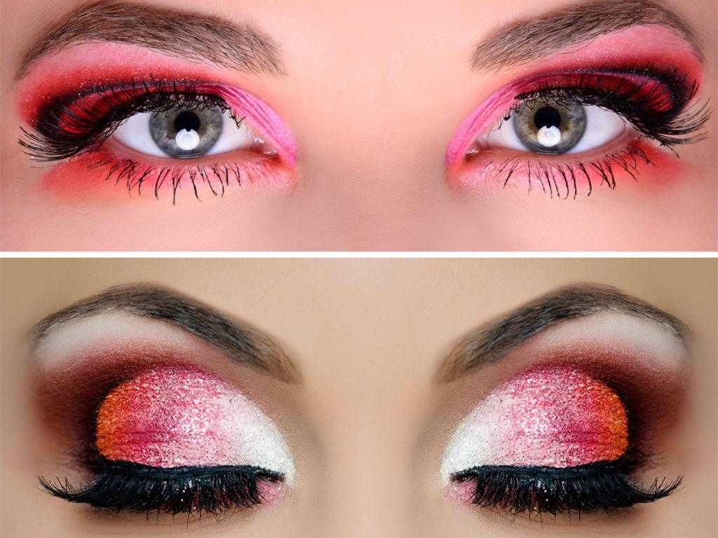 Необычный и смелый мэйк-ап получится с помощью бордового и тёмно-коричневого тона с красноватыми блёстками. Для нежного облика следует взять бирюзовый и ультрамариновый цвета. Такой макияж подойдёт для летнего сезона.