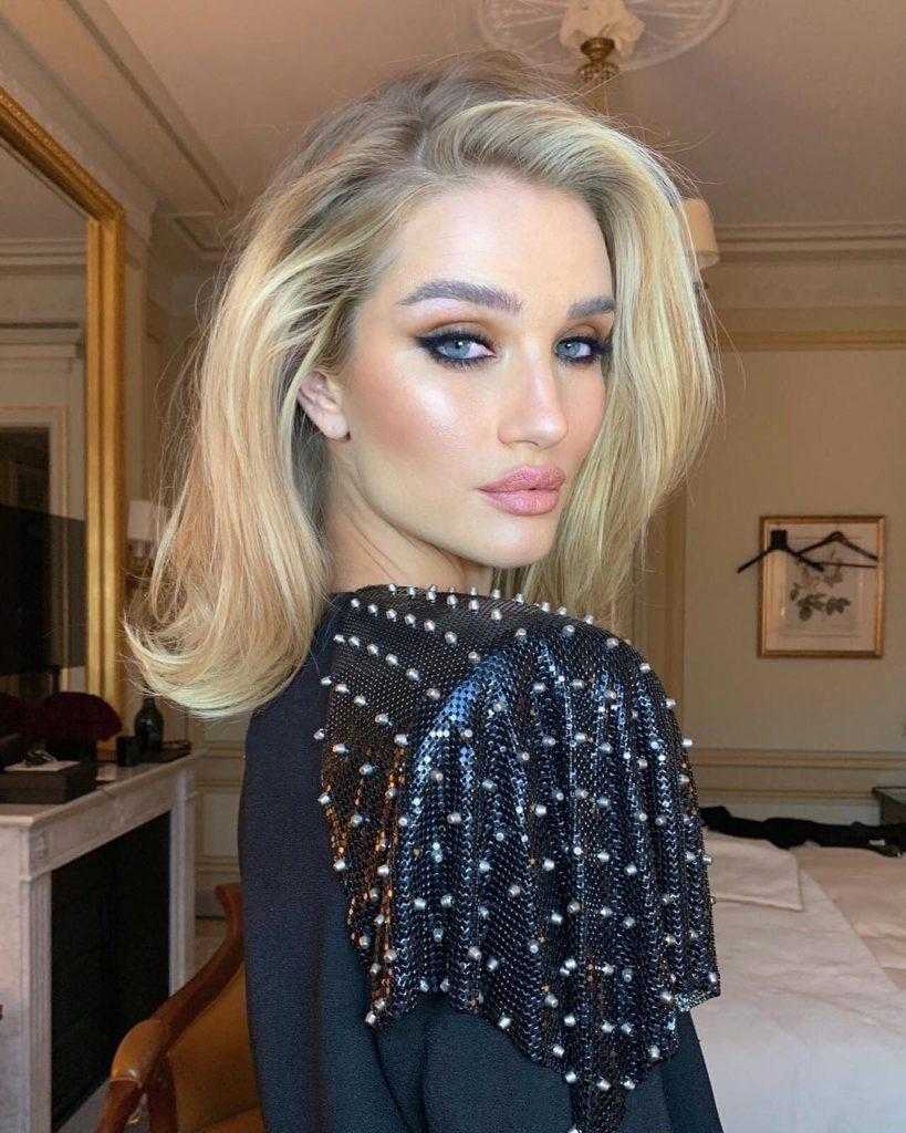 - Голубые глаза. Обладательницы этого цвета радужки, как правило, отличаются светлой, фарфоровой кожей. Чтобы на её фоне глаза не выглядели провалами, черный и подобные слишком темные тона лучше не использовать. Уместнее будет выбрать розовый, серебристый, серый тона. Загорелым красавицам можно поэкспериментировать с коричневыми и золотистыми оттенками, которые подчеркнут контрастный цвет глаз.